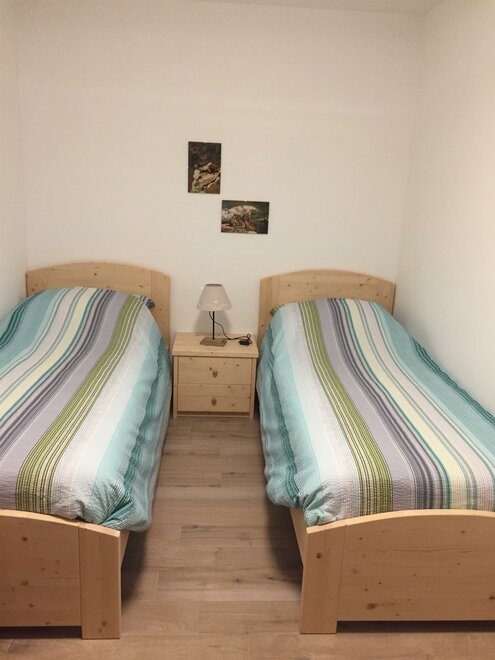 Het biedt twee slaapkamers: een tweepersoonskamer en een kamer met twee eenpersoonsbedden, beide voorzien van een grote kast en commode. De badkamer is nieuw en licht.