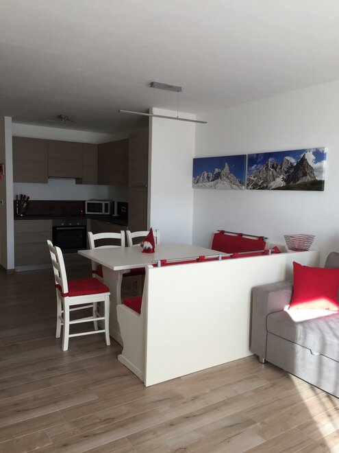 Het appartement is modern ingericht en zorgvuldig afgewerkt. Het bestaat uit een woongedeelte met comfortabele bank, TV, Wi.Fi, een tafel met een hoekbank en een ruime keuken met alle gemakken: vaatwasser, elektrische oven, magnetron.