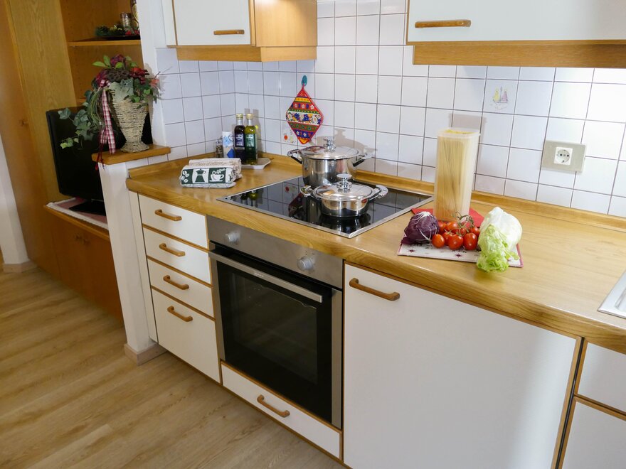keukenhoek compleet met oven, vaatwasser, koelkast met vriezer, vier elektrische keramische kookplaten, tegelvloer