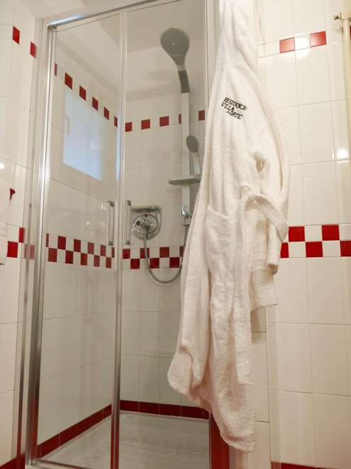 een badkamer uitgerust met douche, wastafel, WC, bidet, haardroger, betegelde vloer;