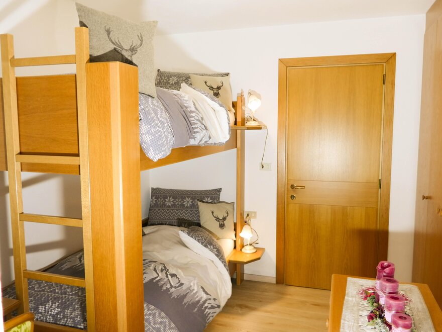 een slaapkamer met een stapelbed, kast en houten vloer;
