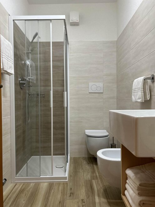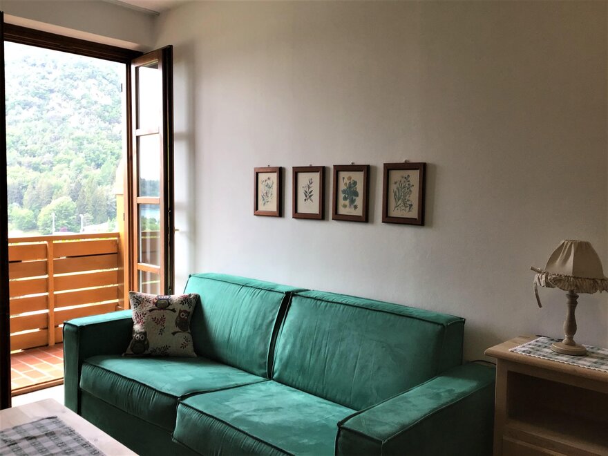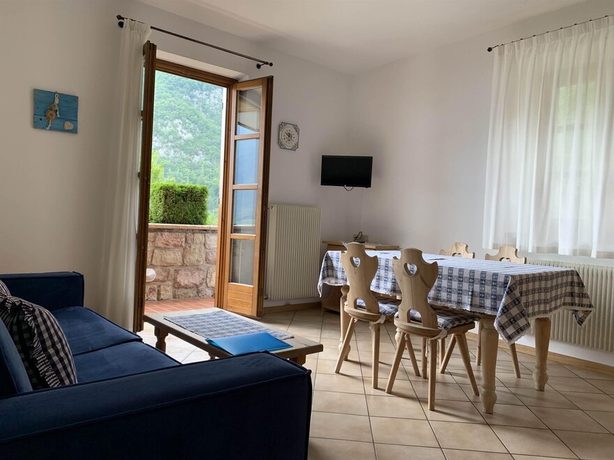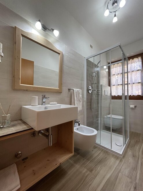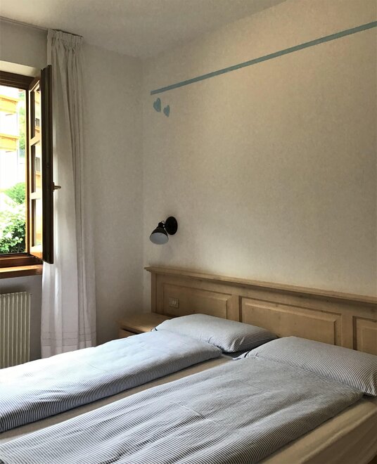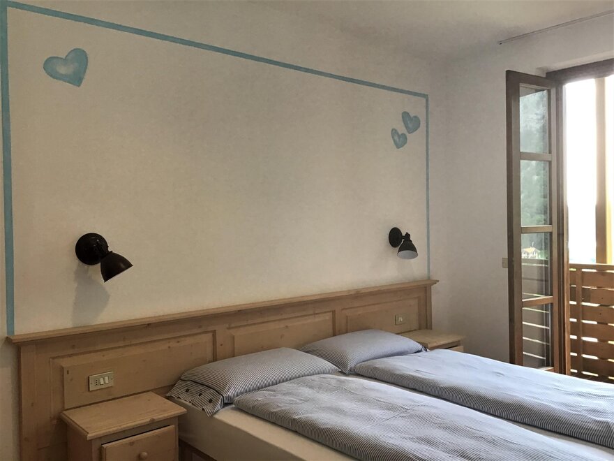 Onze driekamer Genziana beschikt over een slaapkamer met een tweepersoonsbed, een kamer met twee eenpersoonsbedden, een woonkamer met een kitchenette en een tweepersoons slaapbank, en een badkamer met douche. De keuken is volledig uitgerust met een inductiekookplaat, een koelkast met apart vriesvak, een vaatwasser en een magnetron. De schuifdeuren in elke kamer openen naar een balkon met prachtig uitzicht op het meer van Molveno en de Brenta Dolomieten.