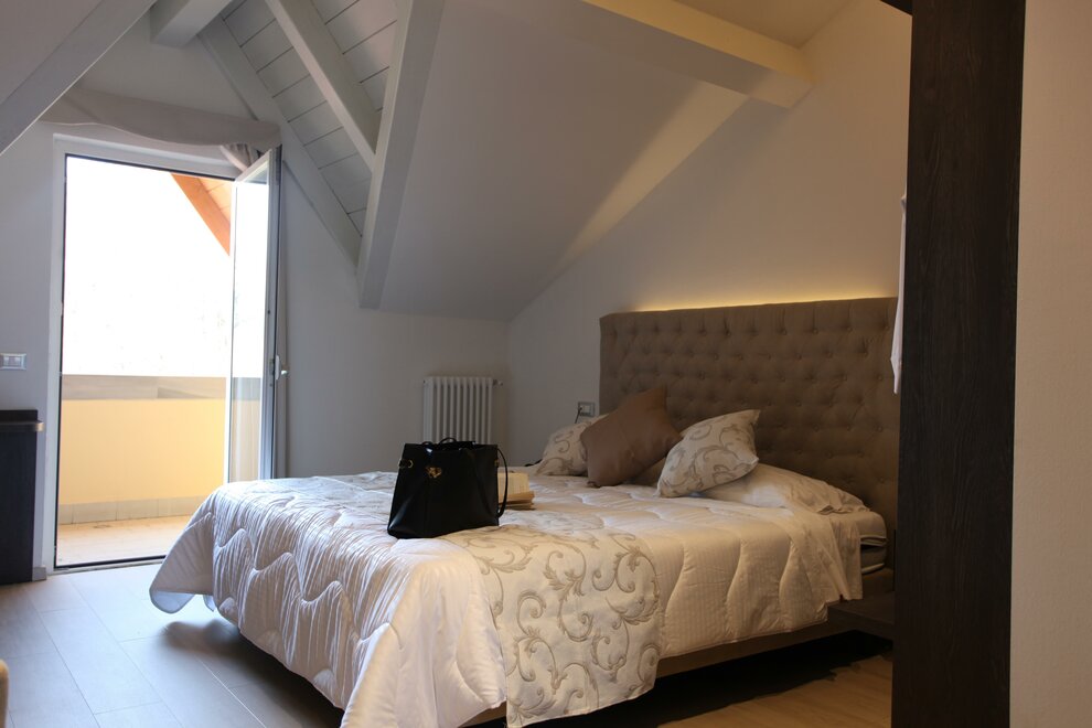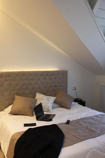 Kamers van 18 tot 30 m² bevinden zich onder het dak, met moderne lijnen en donkere kleuren die contrasteren met de schone witte muren, wat zorgt voor een grote luchtigheid en helderheid in deze ruimtes. De inrichting van deze kamers, volledig op maat gemaakt en net gerenoveerd, biedt de gast meer ruimte en harmonie.