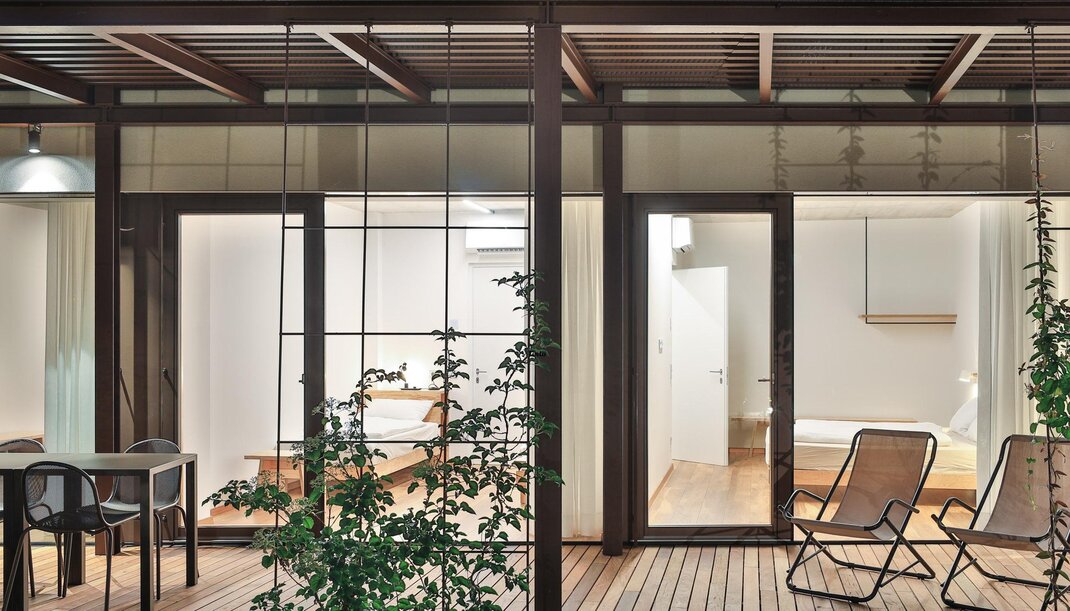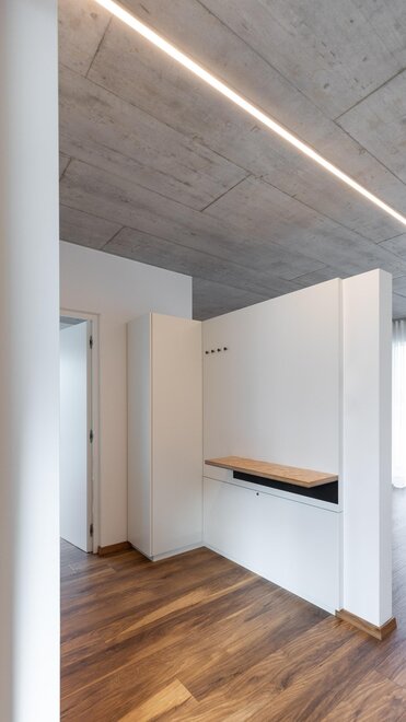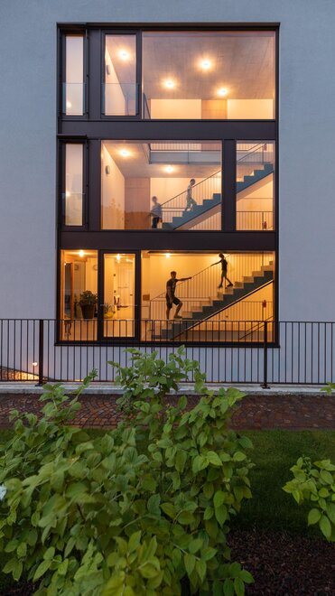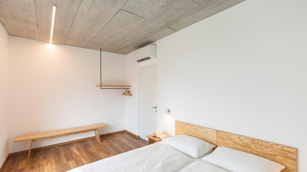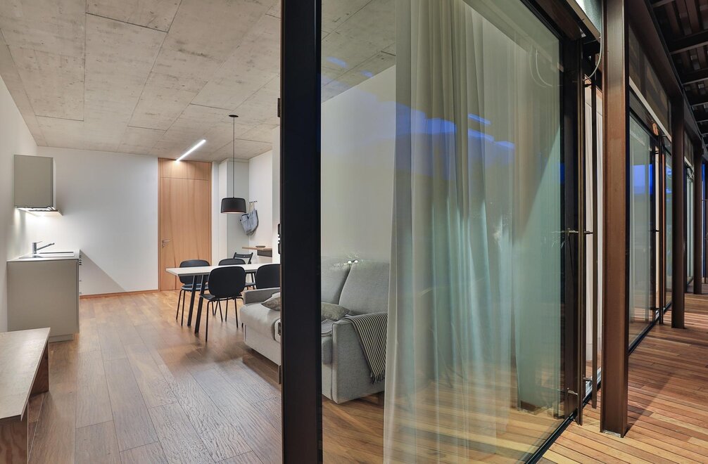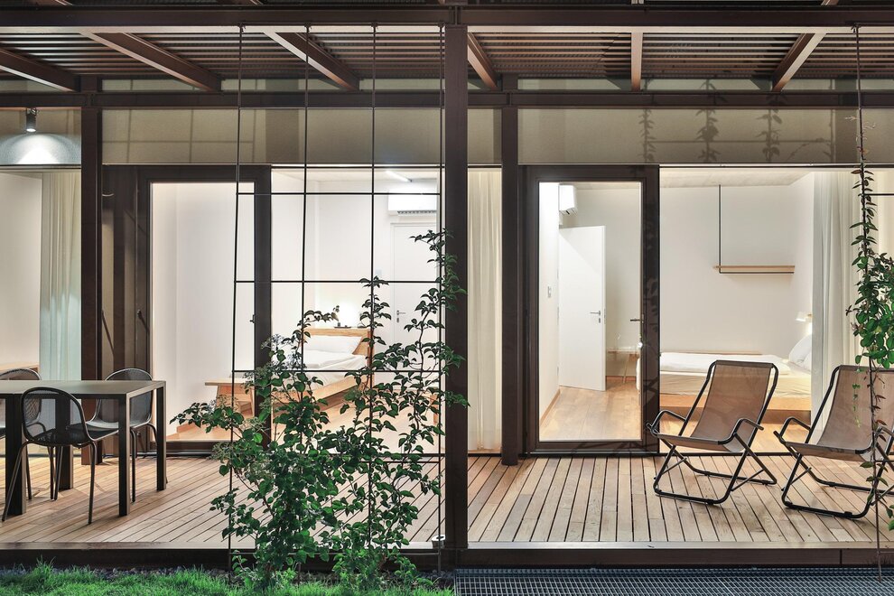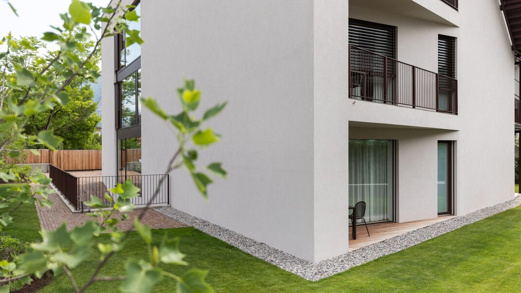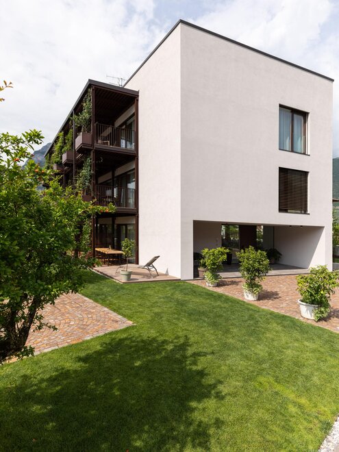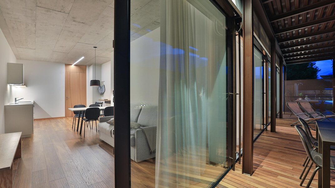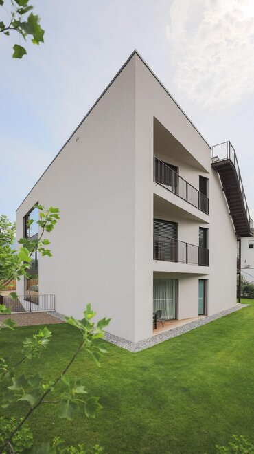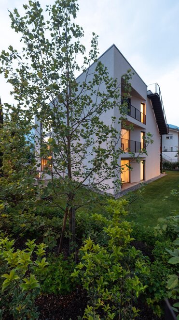 De moderne architectuur bestaat uit 6 appartementen (4 tweekamerappartementen en 2 driekamerappartementen), ingericht op een eenvoudige en minimalistische manier, met garage en videobewakingsfietsenstalling, gemeenschappelijke tuin en beschikbaarheid van verwarmd zwembad van mei tot eind september.