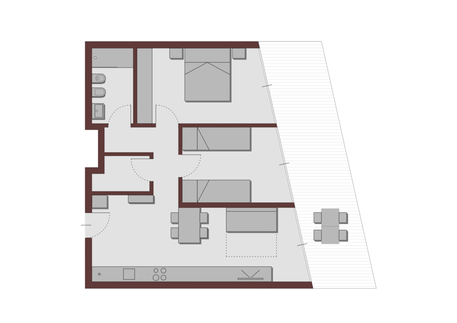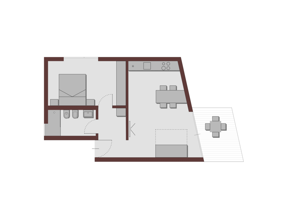 Driedelige appartement op de eerste verdieping, bestaande uit: een slaapkamer met een tweepersoonsbed, een slaapkamer met twee eenpersoonsbedden, een woonkamer met een slaapbank voor twee personen en een kitchenette uitgerust met borden, pannen, bestek, een koelkast, een inductiekookplaat (magnetron op aanvraag), badkamer met douche, ruime veranda van 25 m², gratis WIFI en 1 parkeerplaats in de garage inbegrepen in de prijs