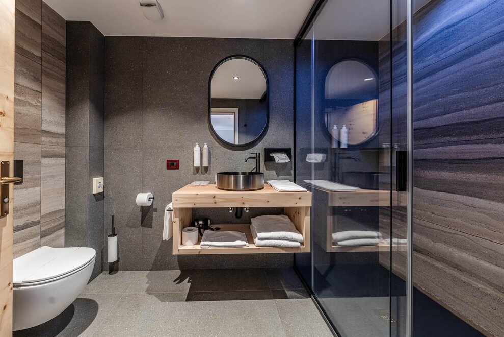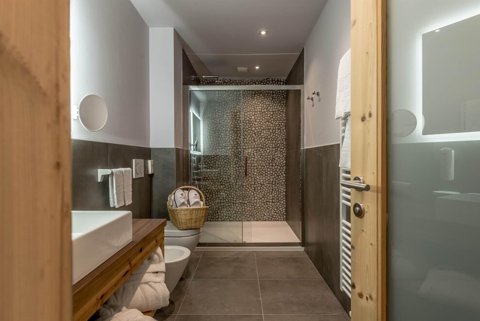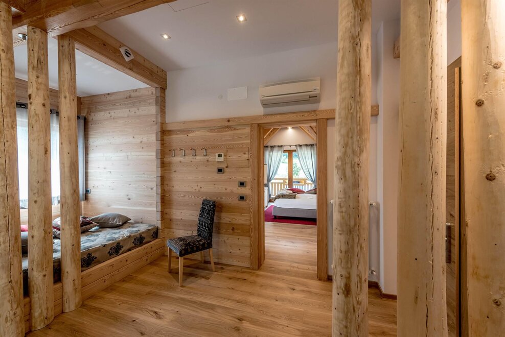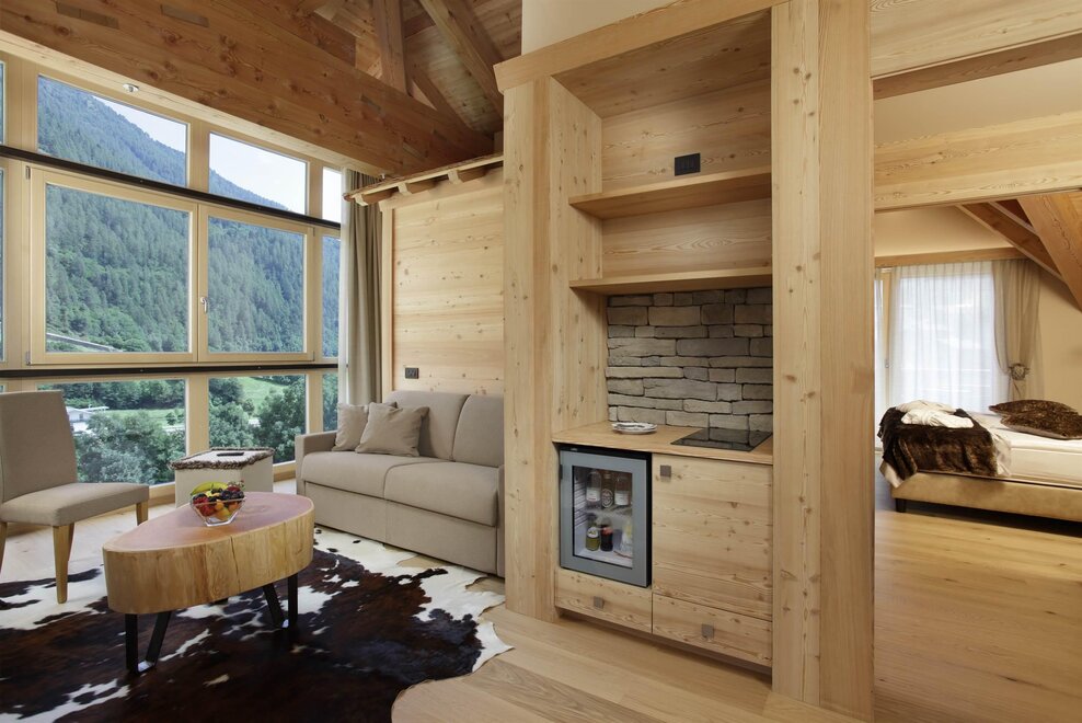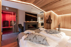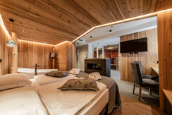 Kamer ingericht in de karakteristieke bergstijl, met natuurlijke tinten en de geur van lariks, die een aangenaam gevoel van frisheid en rust oproept. Voorzien van twee balkons, panoramische ramen, houten vloer, LCD-tv, telefoon met wekfunctie, kluis, Wi-Fi, minibar, airconditioning en een gecontroleerd mechanisch ventilatiesysteem. U vindt een klein keukentje met thee en koffie en een zithoek met bank en open haard. Twee badkamers met douche, privé-toiletten waarvan één met een bad. Wellness tas in de kamer.