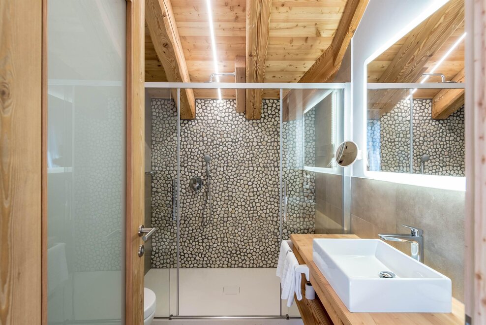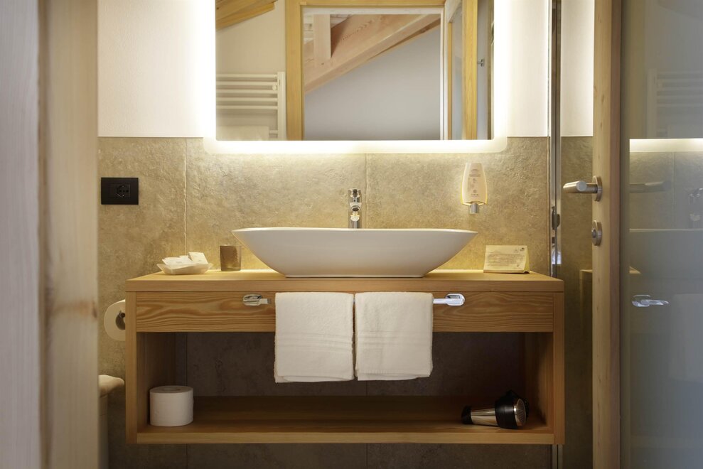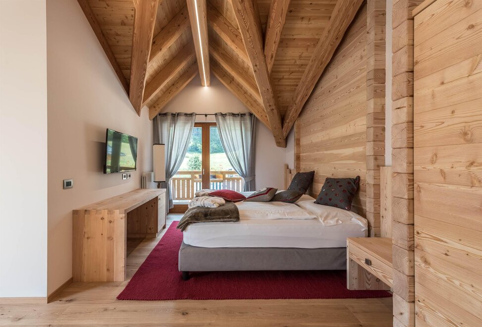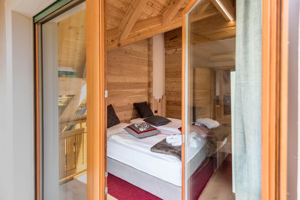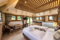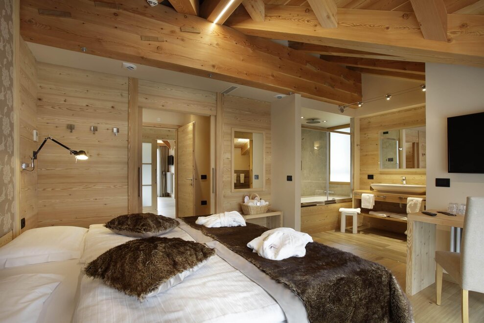 Berghut met eikenhouten vloer, grotendeels mansarded en gelegen op de derde verdieping. Ze beschikken over een comfortabel tweepersoonsbed, een zithoek met bank, tv met Sky-kanalen, Wi-Fi, airconditioning en een gecontroleerd ventilatiesysteem, minibar en balkon met ligstoelen en uitzicht op de bergen. Ruime badkamer met douche, haardroger en set verzorgingsproducten. Wellness tas met badjas, pooldoek en slippers