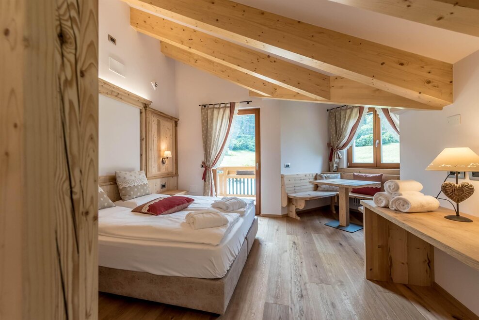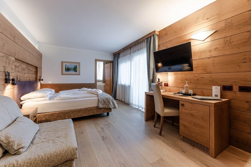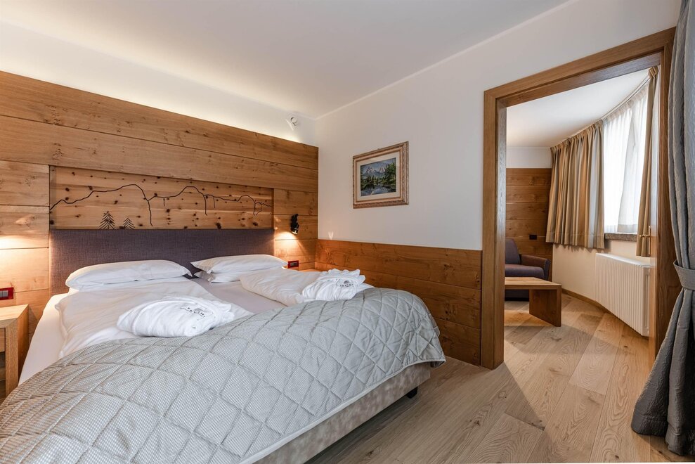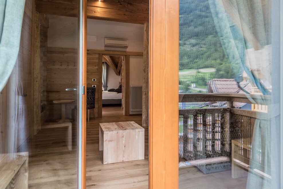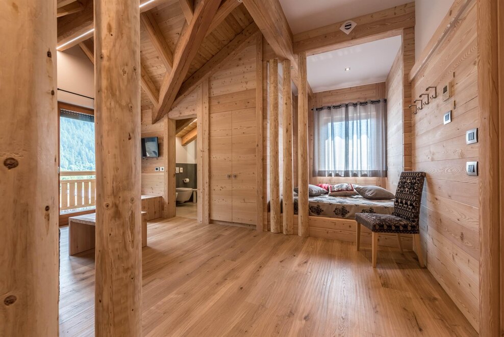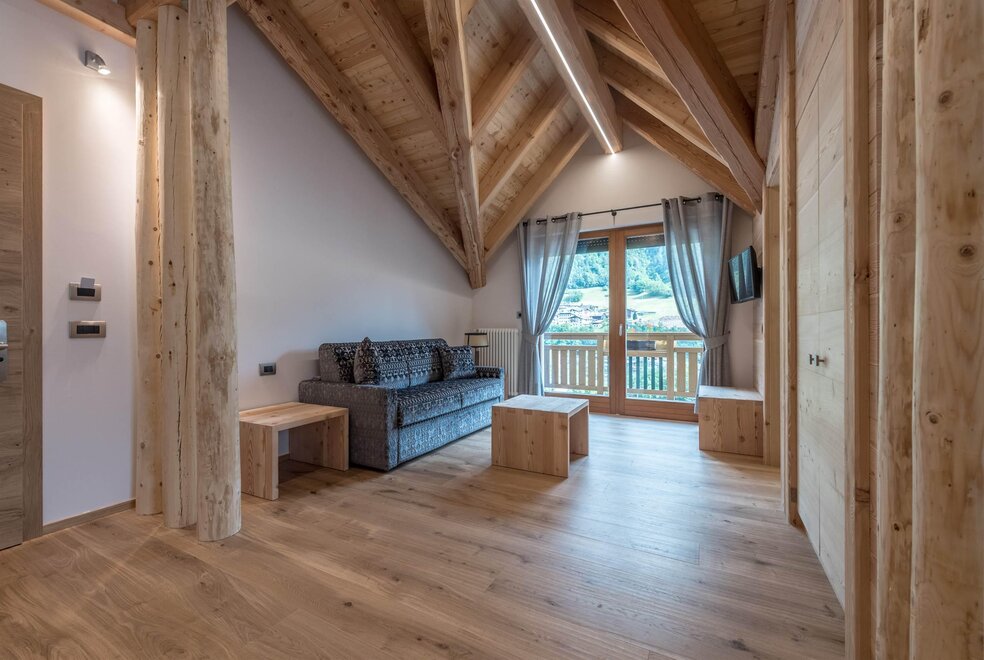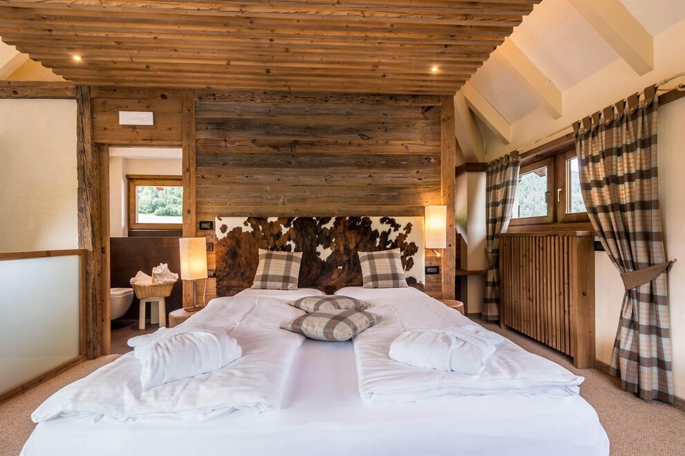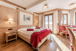 Bergchalet met eikenhouten vloer, meestal mansarded en gelegen op de derde verdieping. Ze beschikken over een comfortabel tweepersoonsbed, een zitgedeelte met bank, TV met Sky-zenders, Wi-Fi, airconditioning en gecontroleerde ventilatie, een minibar en een balkon met ligstoelen en uitzicht op de bergen. Ruime badkamer met douche, haardroger en set luxe toiletartikelen. Wellness tas met badjas, zwembadhanddoek en slippers