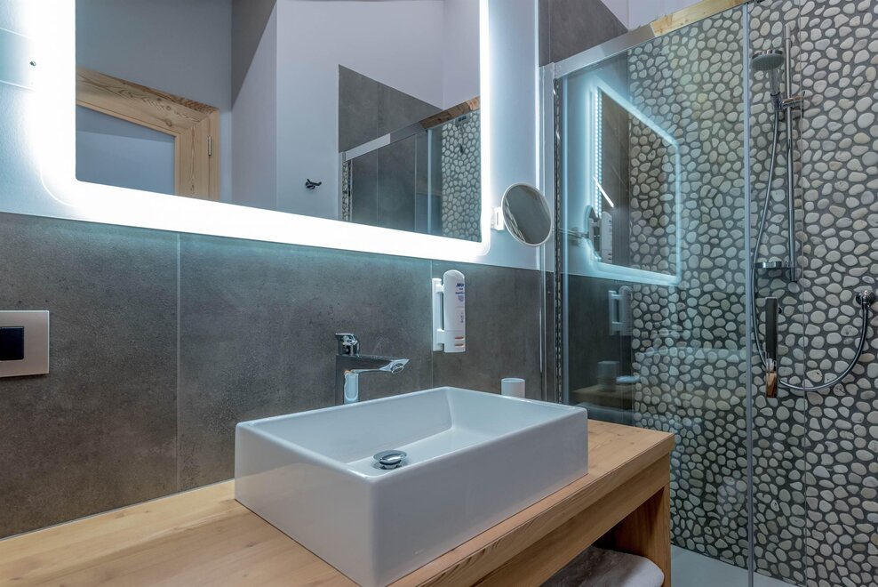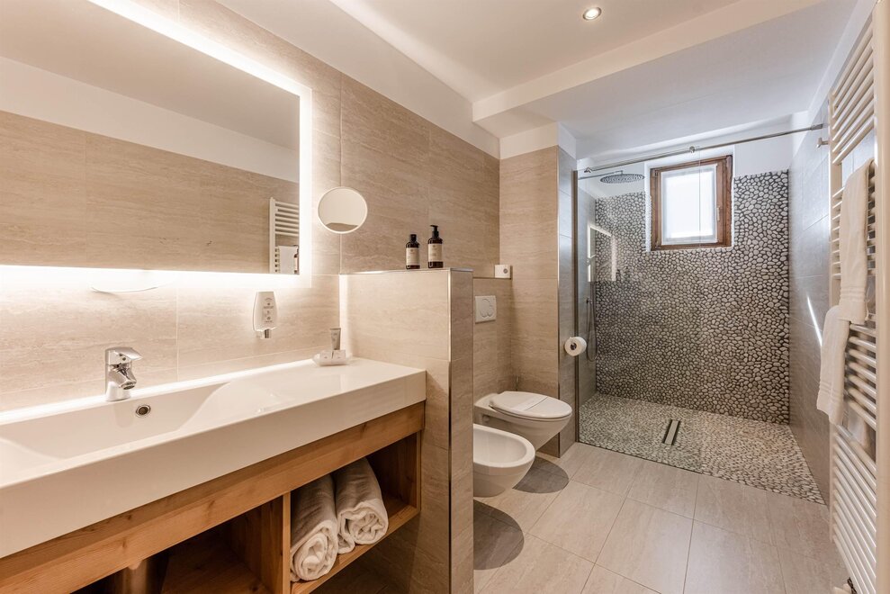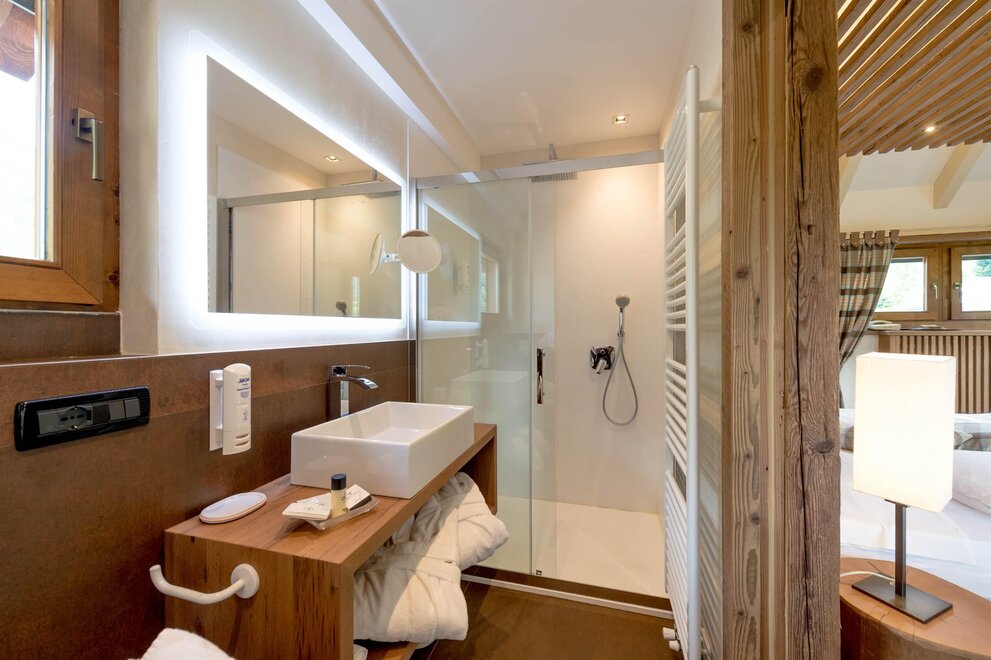 Helder suite onlangs gerenoveerd met typische Tiroler erker, houten meubels en twee terrassen met panoramisch uitzicht. Kluis, telefoon met wekfunctie, minibar, airconditioning, Wi-Fi en LCD-tv in de kamer en in de woonkamer, gecontroleerd ventilatiesysteem. Ruime badkamer met douche, haardroger en set toiletartikelen. Wellness tas op de kamer.