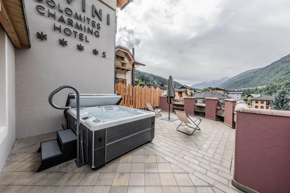Oude en elegante junior suite voor 2-4 personen. Beschikt over een comfortabel tweepersoonsbed, een zithoek met bank en stoel, eikenhouten vloer, LCD-TV, Wi-Fi, minibar, airconditioning, een groot terras met ligstoelen, een jacuzzi en uitzicht op de bergen. Ruime badkamer met douche, haardroger en verzorgingsproducten. Wellness tas op de kamer. Voorzien van een gecontroleerd ventilatiesysteem.