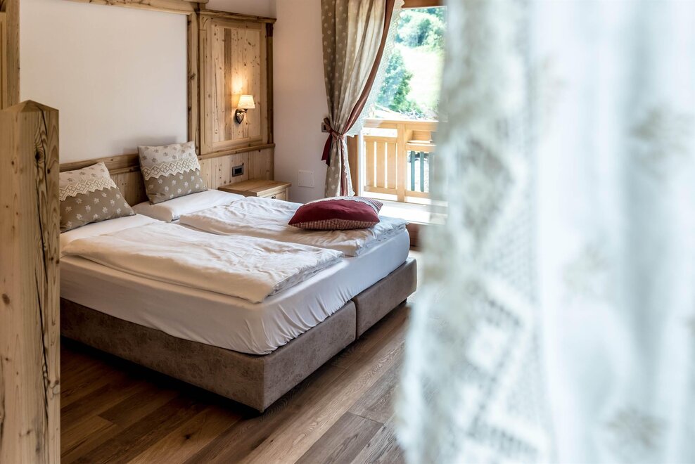 Berghut met eikenhouten vloer, meestal beschoten en gelegen op de derde verdieping. Ze beschikken over een comfortabel tweepersoonsbed, een zitje met bank, tv met Sky-zenders, Wi-Fi, airconditioning en een gecontroleerd ventilatiesysteem, minibar en balkon met ligstoelen en uitzicht op de bergen. Ruime badkamer met douche, haardroger en set met toiletartikelen. Wellness tas met badjas, zwembadhanddoek en slippers
