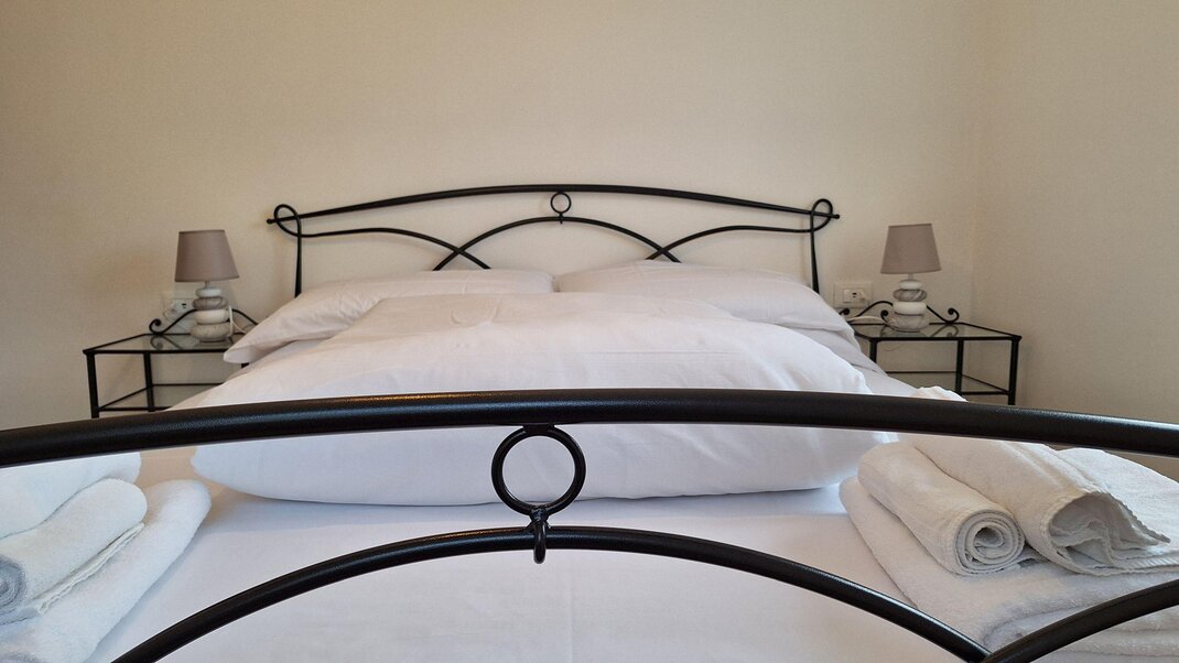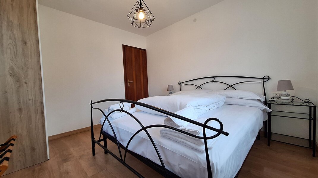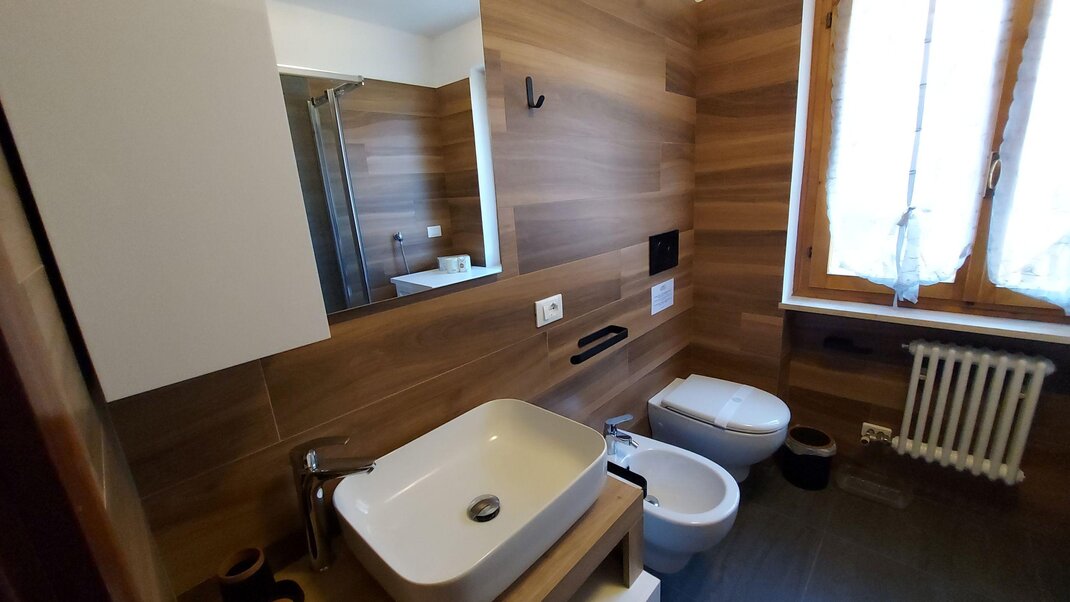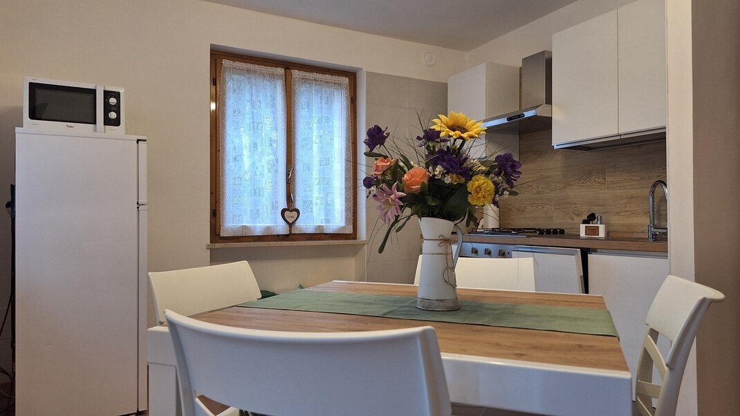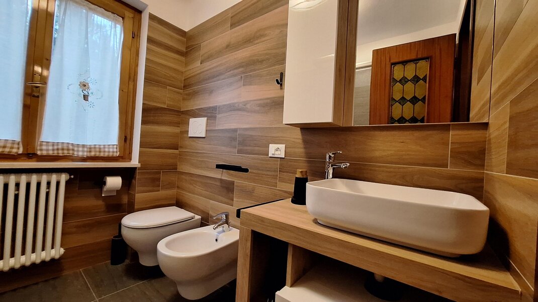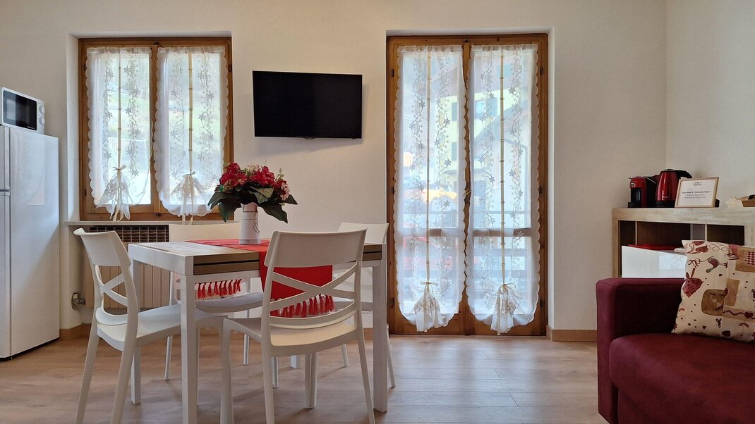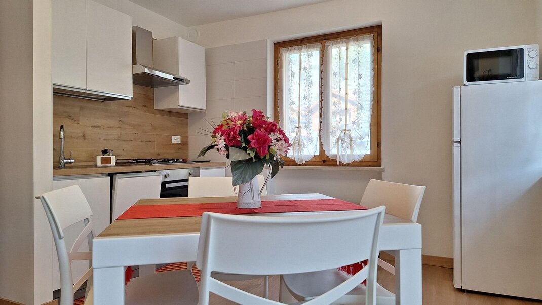Apartament oferuje widok na 360° na wszystkie góry otaczające Val Rendena. Składa się z salonu, kuchni, łazienki prywatnej z dużym prysznicem i pralką, dwu sypialni małżeńskich oraz dwóch panoramicznych balkonów. Łącznie może wygodnie pomieścić do 6 osób dzięki rozkładanemu sofy umieszczonemu w salonie. Główna sypialnia może pomieścić łóżeczko lub turystyczne łóżko, które można zamówić bezpłatnie w momencie rezerwacji. Kuchnia jest wyposażona, aby zapewnić naszym gościom maksymalny komfort, a oprócz zestawu garnków i naczyń obejmuje: aneks kuchenny, piekarnik, mikrofalówkę, Zmywarkę, czajnik, ekspres do kawy, toster, lodówkę i zamrażarkę. Wyposażenie apartamentu obejmuje pościel, ręczniki, produkty do higieny osobistej oraz środki czystości. Na pobyty dłuższe niż 7 dni można zamówić dodatkową usługę sprzątania apartamentu oraz wymiany pościeli.