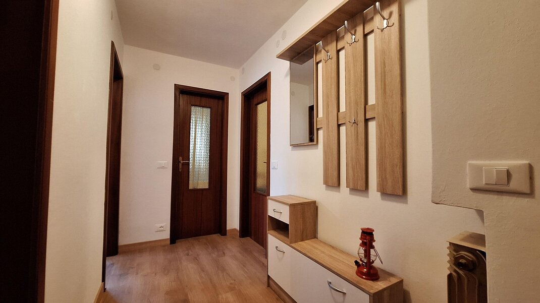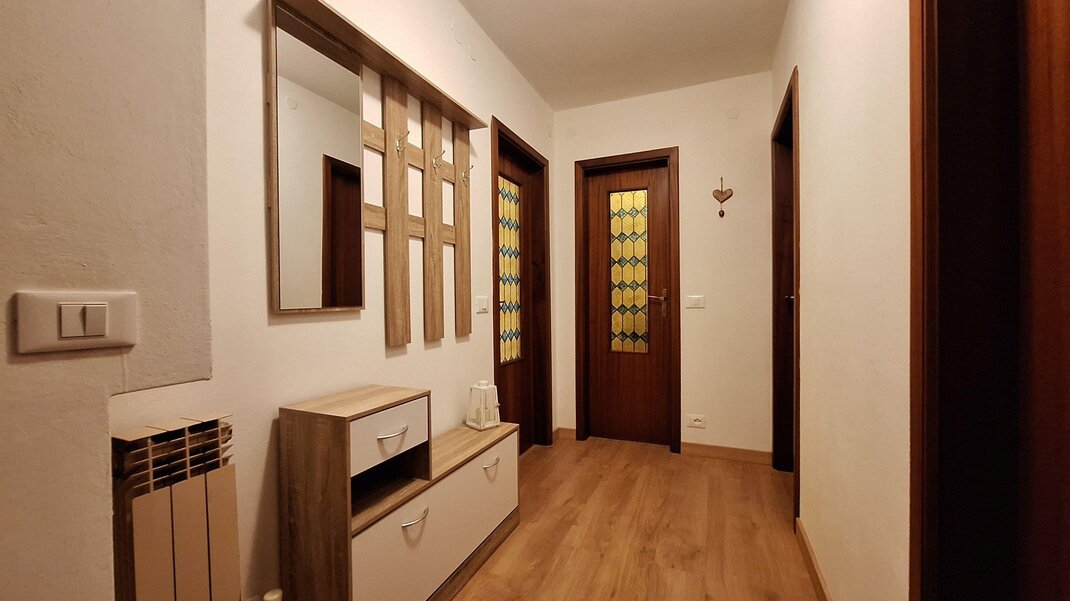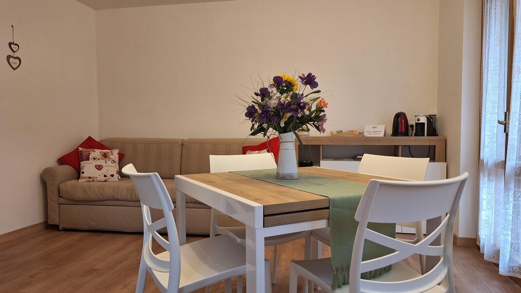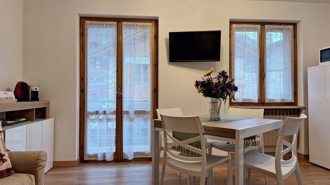 Apartament oferuje widok rozciągający się na 360° na wszystkie góry otaczające Val Rendena. Składa się z salonu, kuchni, łazienki z oknem i dużym prysznicem oraz pralki, dwóch sypialni małżeńskich i dwóch widokowych balkonów. W sumie może komfortowo pomieścić do 6 osób, dzięki rozkładanej kanapie w salonie. Główna sypialnia małżeńska może pomieścić łóżeczko lub łóżko turystyczne, które można zamówić bezpłatnie w momencie rezerwacji. Kuchnia jest wyposażona, aby zapewnić naszym gościom maksymalny komfort i, oprócz zestawu garnków i naczyń, zawiera: kącik do gotowania, piekarnik, mikrofalówkę, zmywarkę, czajnik, ekspres do kawy, toster, lodówkę i zamrażarkę. Wyposażenie apartamentu obejmuje pościel, ręczniki, produkty do higieny osobistej oraz środki czyszczące. W przypadku pobytów dłuższych niż 7 dni można zamówić dodatkową usługę sprzątania apartamentu oraz wymiany pościeli.