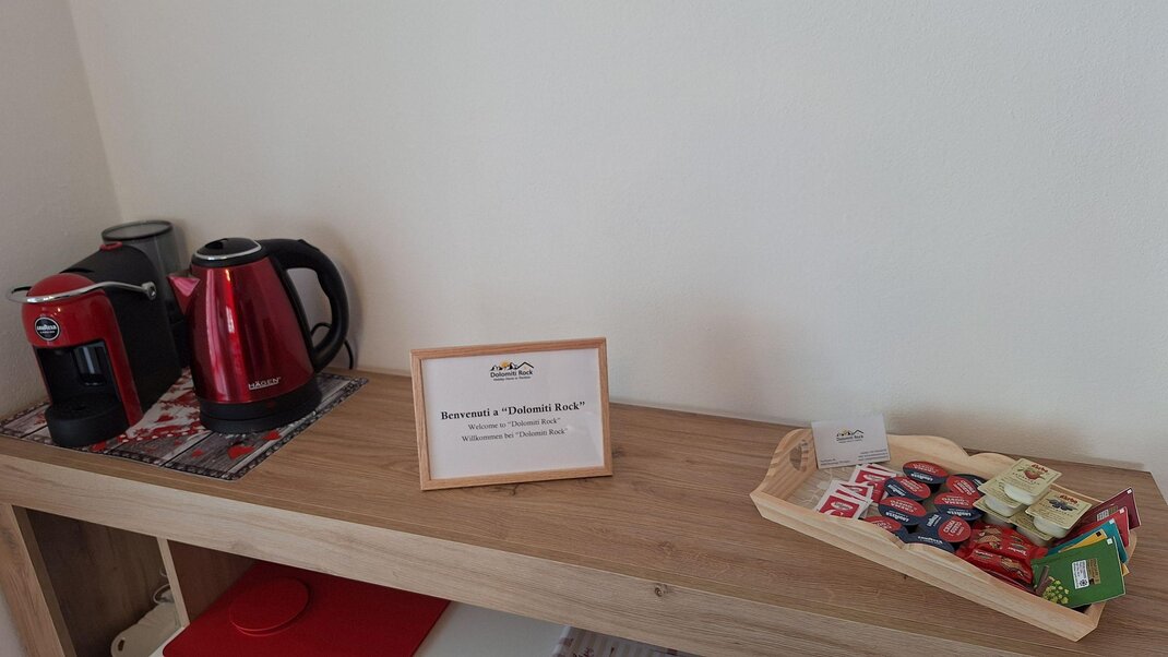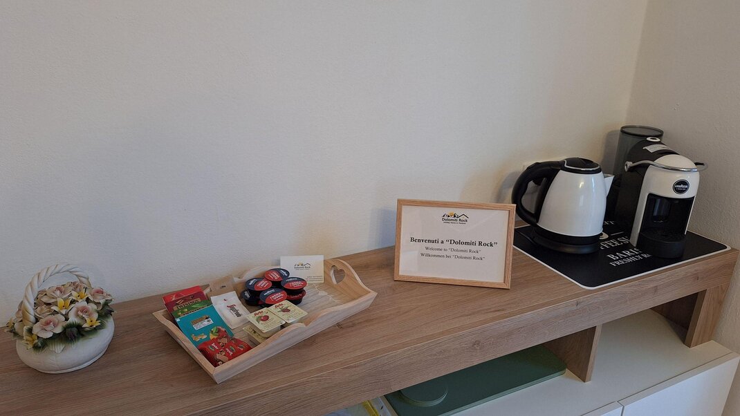 "Dolomiti Rock" to projekt powstały w 2024 roku, dlatego wszystko, co znajdziesz podczas pobytu, jest nowe i recentne. Zaprojektowaliśmy i zaaranżowaliśmy każdą przestrzeń z dbałością i uwagą na każdy szczegół, aby zapewnić ci jak największy komfort podczas pobytu, tak jakbyś był częścią rodziny. Gościnność jest dla nas święta, a nasze zamierzenie uda się, tylko jeśli poczujesz się naprawdę jak w domu! Apartamenty mają dogodne położenie i wyposażone są w panoramiczny balkon, z którego można podziwiać widok na całą Val Rendena i jej szczyty. Staraliśmy się poświęcić jak najwięcej uwagi usługom dla wszystkich typów gości: rodzin, par, dzieci i osób starszych. Przede wszystkim wyposażono kuchnię, aby niczego nie brakowało: od podstawowego wyposażenia (garnki, naczynia, szklanki, sztućce i wszystko, co potrzebne do gotowania) po sprzęt AGD (zmywarka, lodówka, zamrażarka, piekarnik, kuchenka mikrofalowa, ekspres do kawy, czajnik, toster). W apartamencie znajdziesz również pralkę i suszarkę. Łazienka, prywatna, jest wyposażona w prysznic termostatyczny, który utrzymuje stałą temperaturę wody. Oferujemy również w zestawie, w cenie: ręczniki, pościel, poszewki, podwójne poduszki, dodatkowe koce, produkty do czyszczenia, produkty do higieny osobistej i zestaw powitalny. Każdemu apartamentowi przypisane jest bezpłatne miejsce parkingowe na prywatnej działce. Od maja 2025 roku dostępna, za dodatkową opłatą, dla gości będzie stacja ładowania dla samochodów elektrycznych i hybrydowych. Dzieci są mile widziane. Mam również syna i dlatego bardzo dbam o potrzeby gości podróżujących z dziećmi. W przeciwieństwie do innych obiektów dzieci w wieku 0-6 lat u nas mieszkają bezpłatnie, a dla dzieci w wieku 7-14 lat przewidziana jest tylko niewielka opłata, która pomaga pokryć koszty. Dysponujemy łóżeczkami, materacami i innymi dodatkowymi usługami na życzenie.