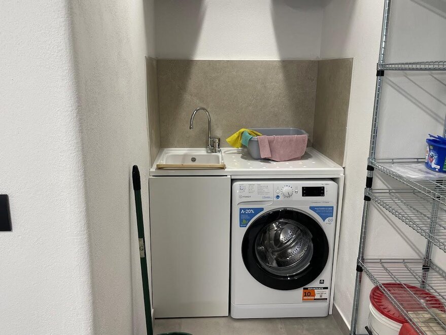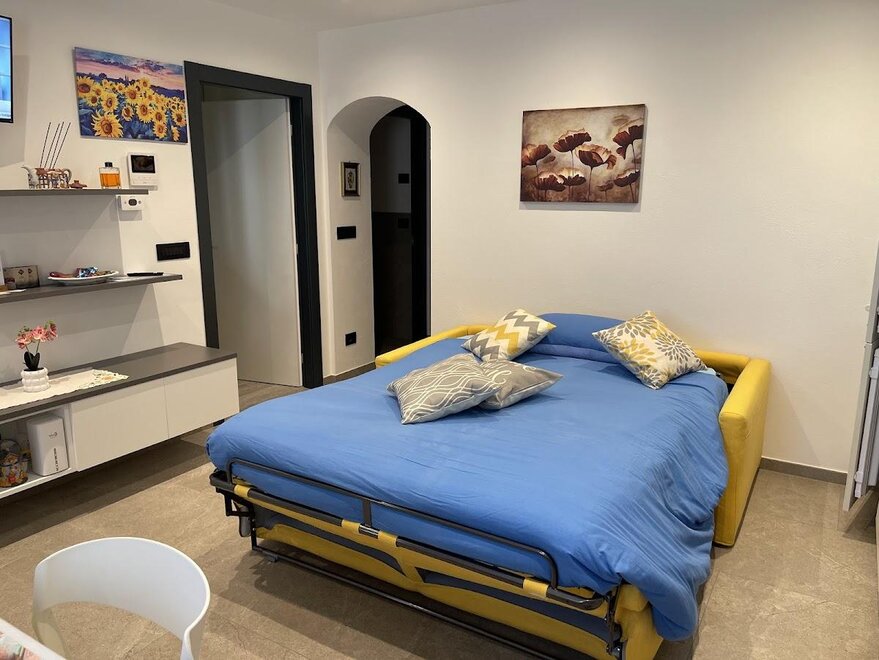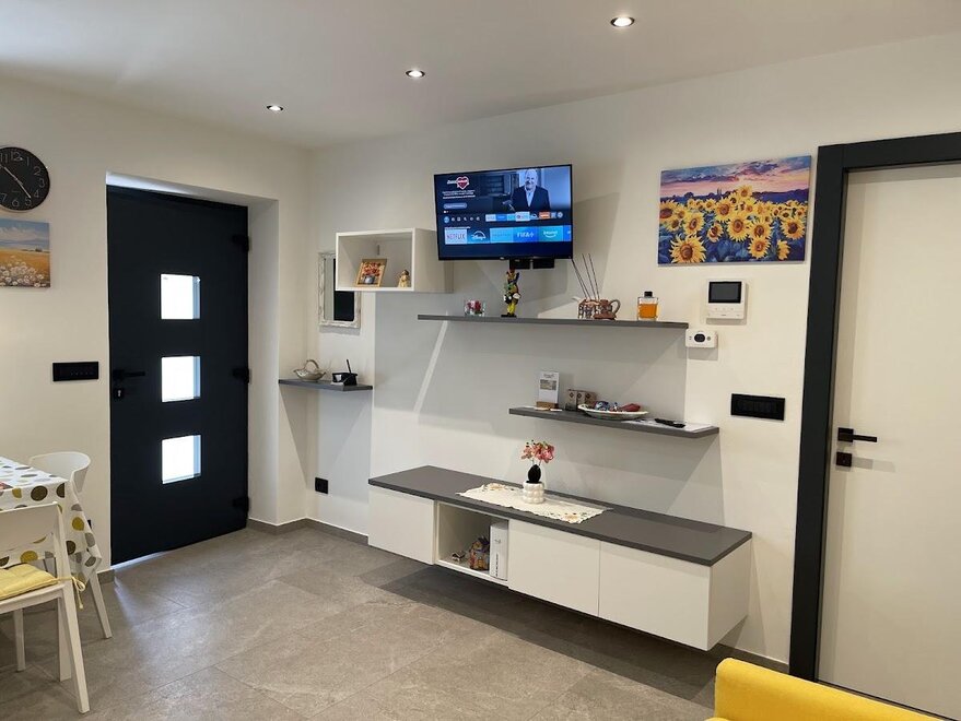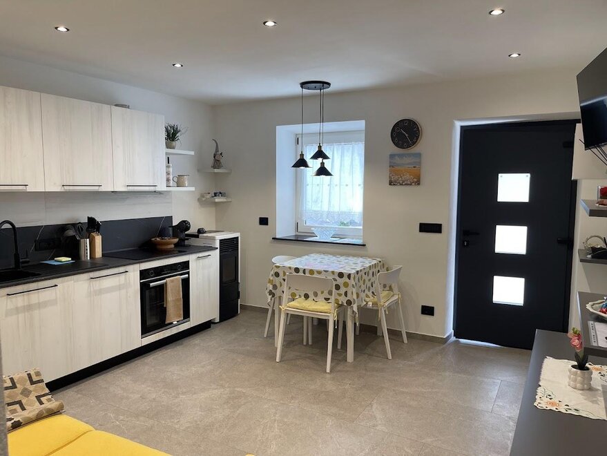 Małe mieszkanie składające się z salonu z sofrą dwuosobową i kuchnią, jednej sypialni oraz łazienki z oknem i prysznicem. Starannie urządzone, oferuje intymny i komfortowy pobyt.