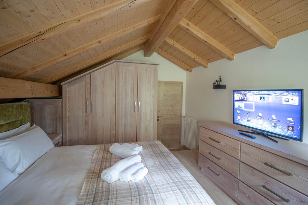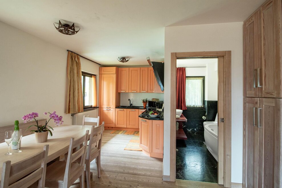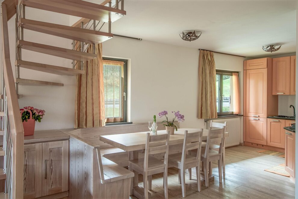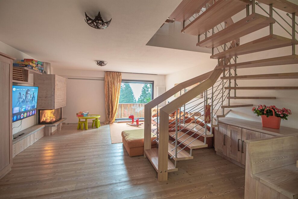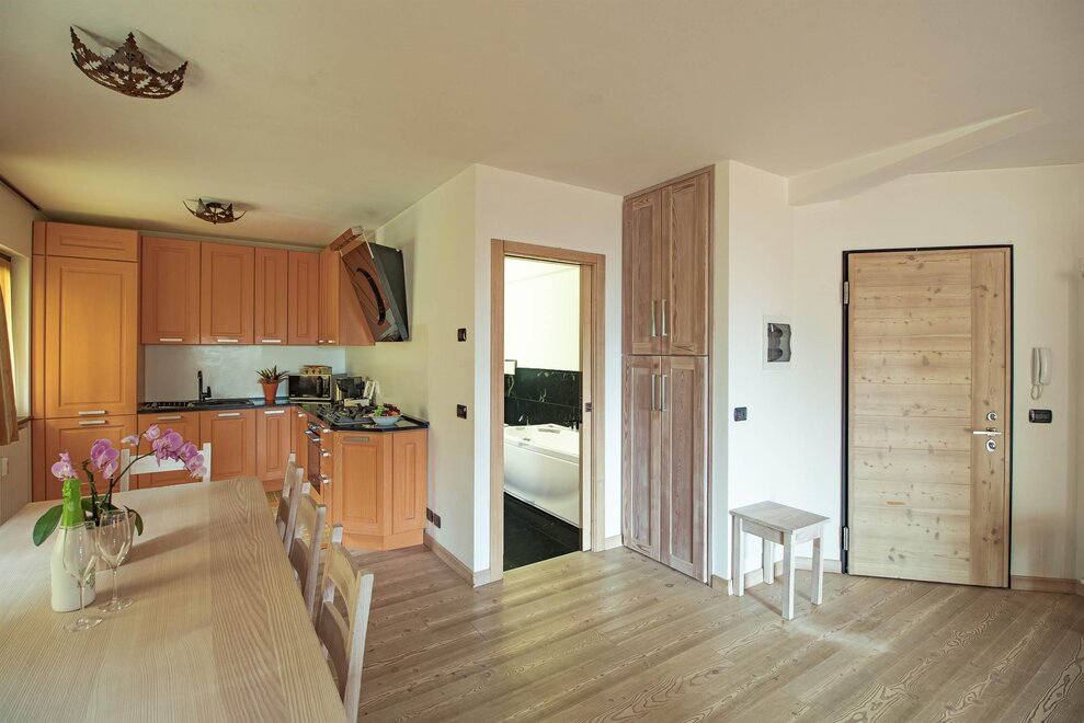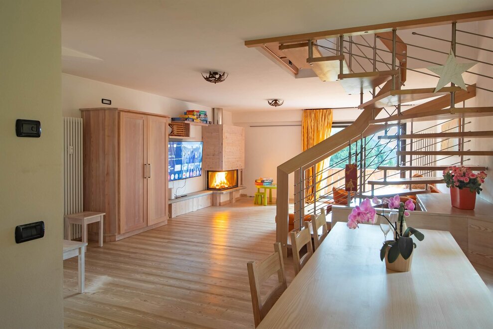 Na parterze wita Was przestronny salon z dużą kanapą narożną, telewizorem smart i kominkiem: to serce domu, gdzie można się zrelaksować po dniu spędzonym na stokach lub szlakach. Duże okno zapewnia wspaniały widok na Dolomity i napełnia pomieszczenia naturalnym światłem. Obok znajduje się przestronna i w pełni wyposażona kuchnia z dużym drewnianym stołem, zachęcająca do wspólnego spożywania obiadów i kolacji. Na piętrze znajduje się także łazienka z wanną z hydromasażem, idealna na chwile czystego relaksu.