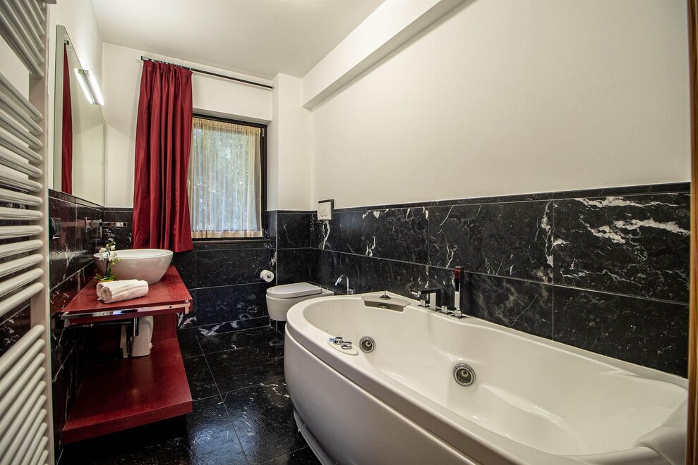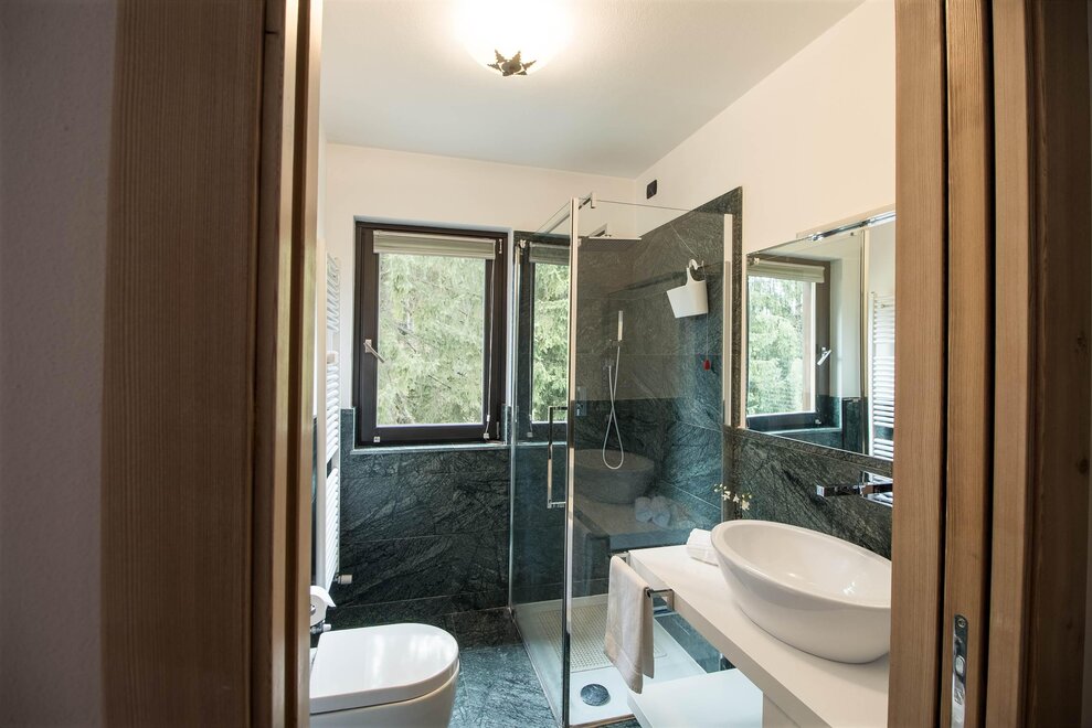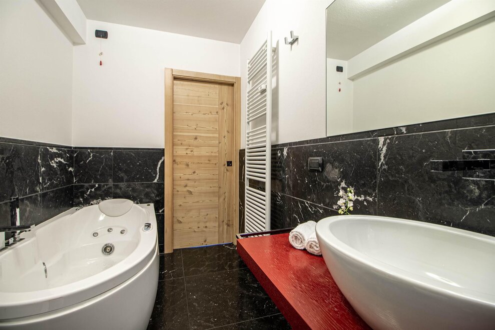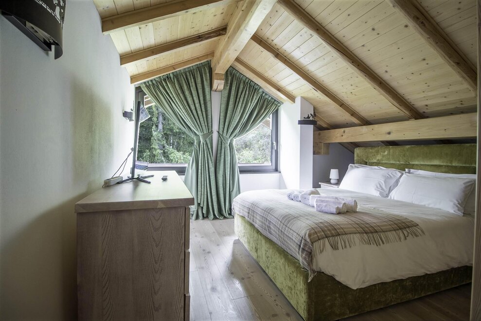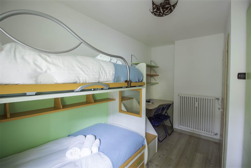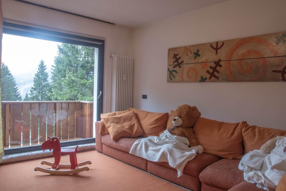 Na zewnątrz dom jest otoczony zielenią i spokojem. Wspólny ogród oferuje miejsce zabaw dla najmłodszych oraz kort tenisowy, a tuż przed domem znajduje się przystanek skibusu, który w kilka minut dowiezie na stoki narciarskie i do centrum Madonna di Campiglio.