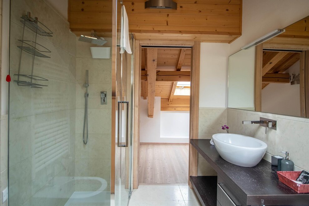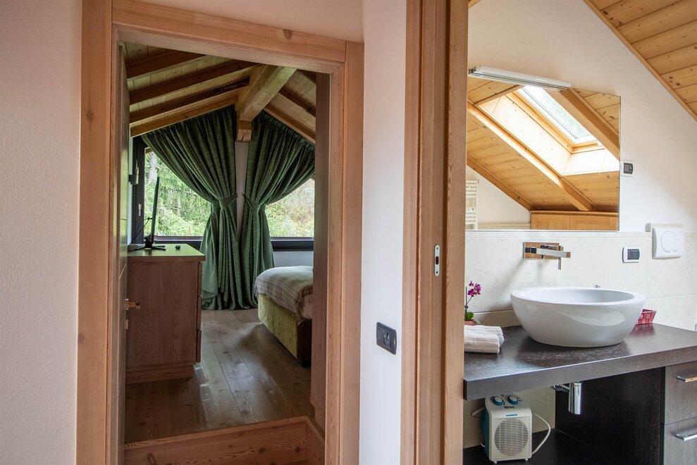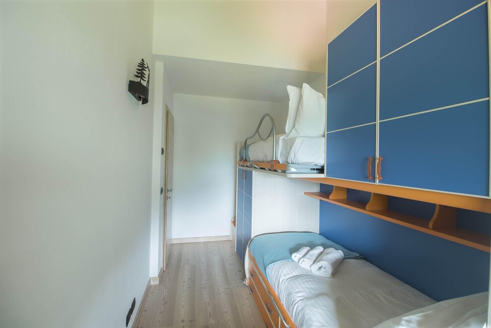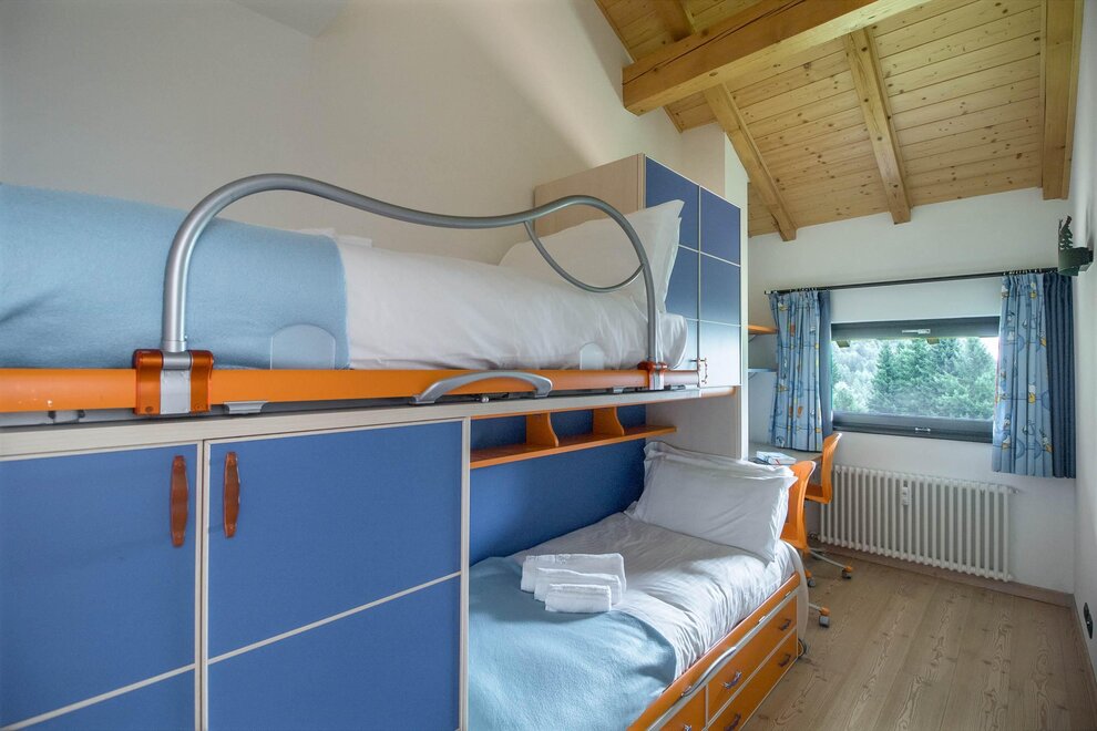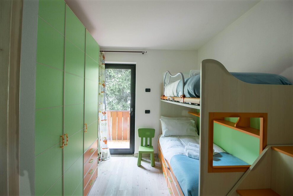 Wchodząc po drewnianych schodach, docieracie na drugie piętro, gdzie znajdują się dwie sypialnie małżeńskie w stylu alpejskim oraz dwa kolorowe pokoje dla dzieci, zaprojektowane, aby czuły się jak w domu również na wakacjach. Na tym samym piętrze jest nowoczesna łazienka z prysznicem oraz prywatna pralnia, idealna na dłuższe pobyty.