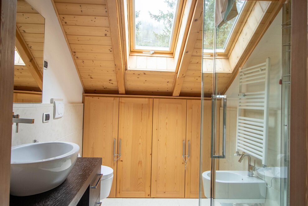 Na ostatnim piętrze, pod drewnianymi belkami, czeka na Was panoramiczna sypialnia małżeńska, małe gniazdko z widokiem na lasy oraz prywatna łazienka z prysznicem i naturalnymi wykończeniami.
