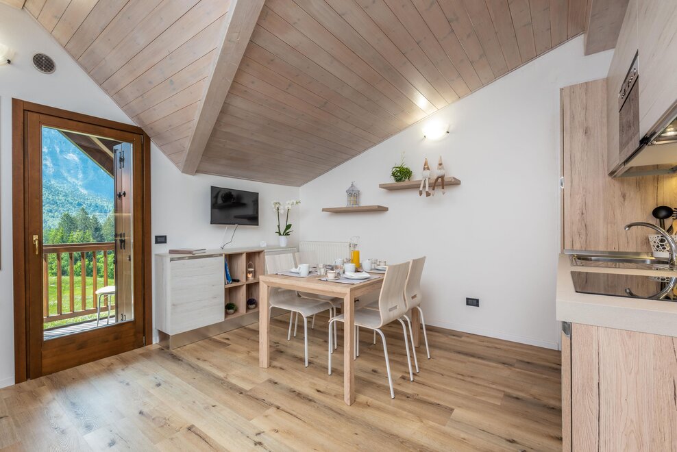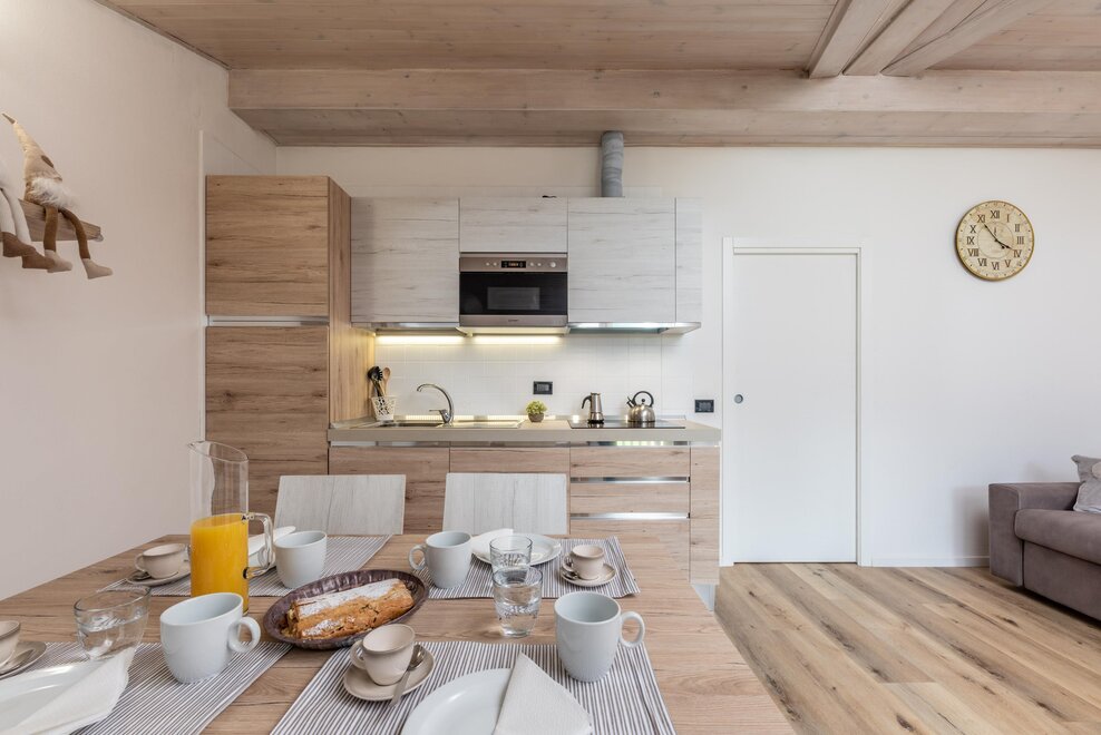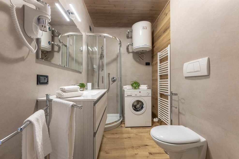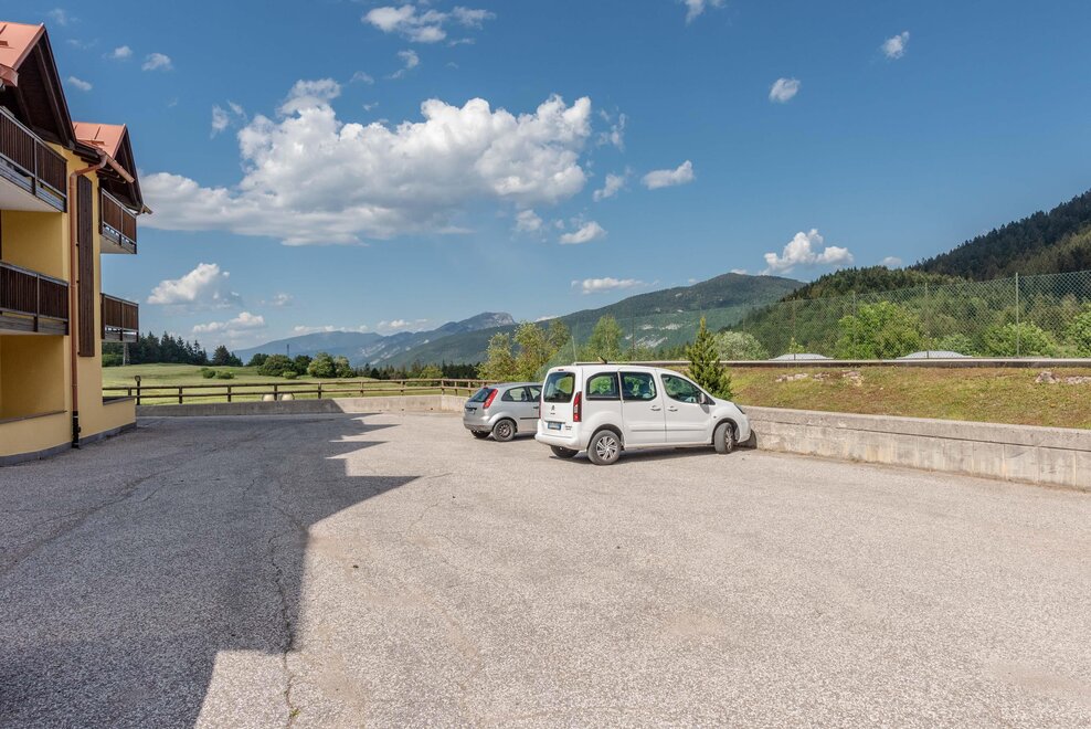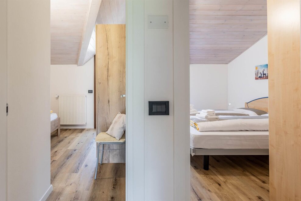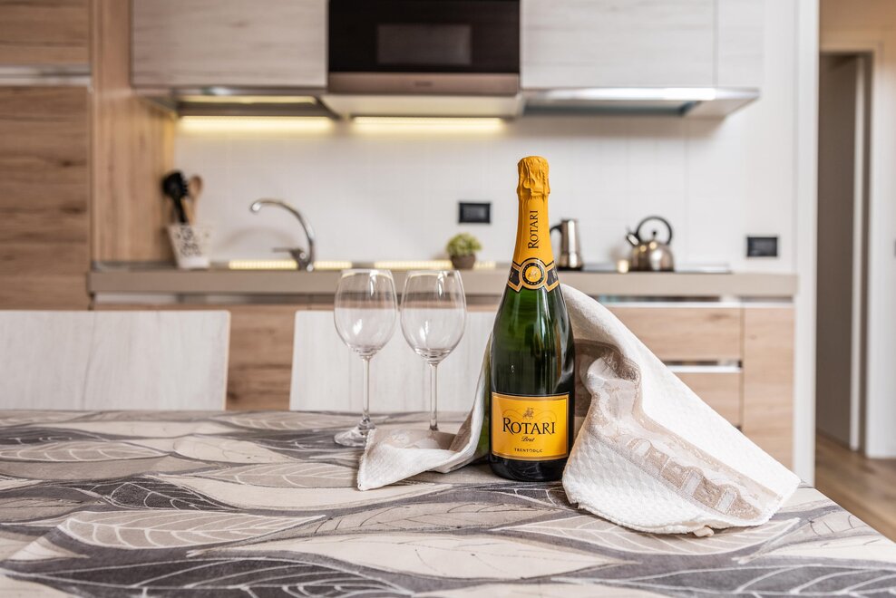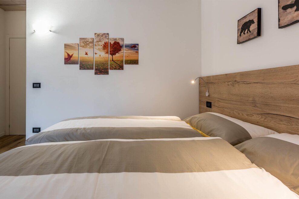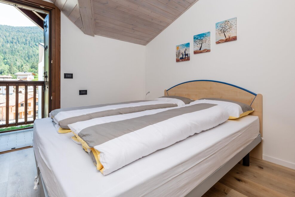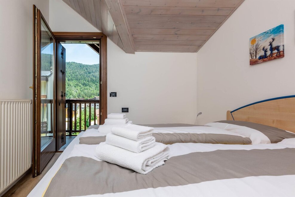 Kuchnia-żyjnia prowadzi na taras z pięknym widokiem na Dolomity di Brenta. Są dwie sypialnie małżeńskie, obie z drzwiami na balkon, które umożliwiają dostęp do drugiego balkonu. Rozkładana sofa podwójna pozwala na zakwaterowanie 6 osób. Przestronna łazienka wyposażona jest w prysznic, bidet, pralkę oraz suszarkę do włosów. Kuchnia jest wyposażona w płytę indukcyjną, lodówkę z zamrażarką, kuchenkę mikrofalową i zmywarkę, telewizor z płaskim ekranem, darmowy Internet-wi-fi. Powierzchnia całkowita 60 m².