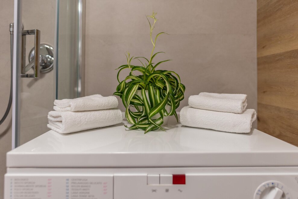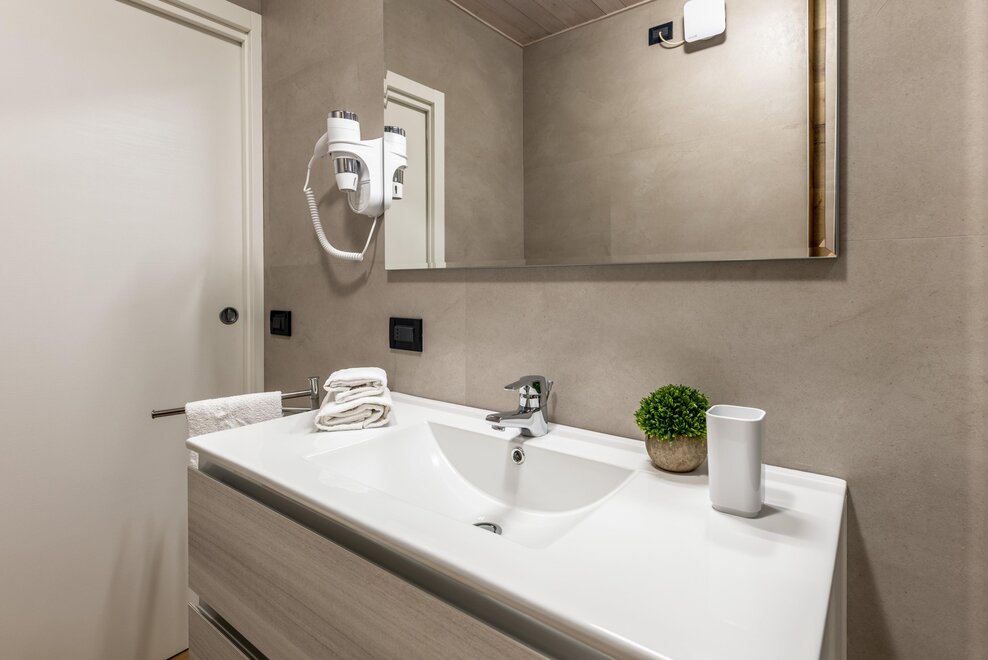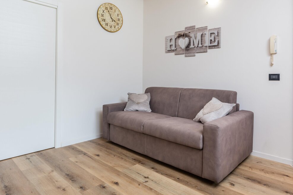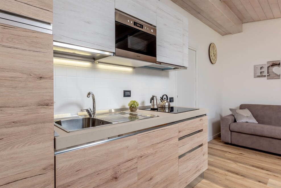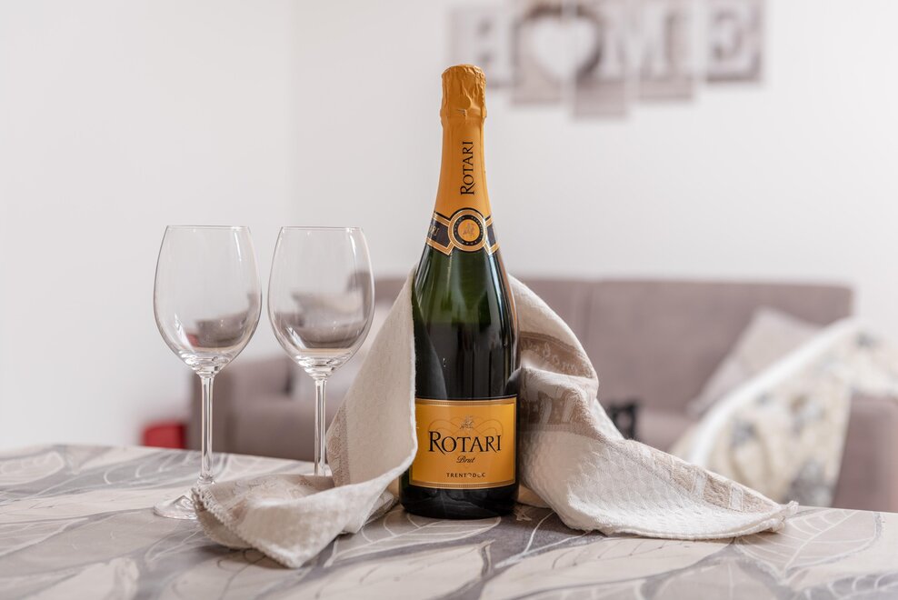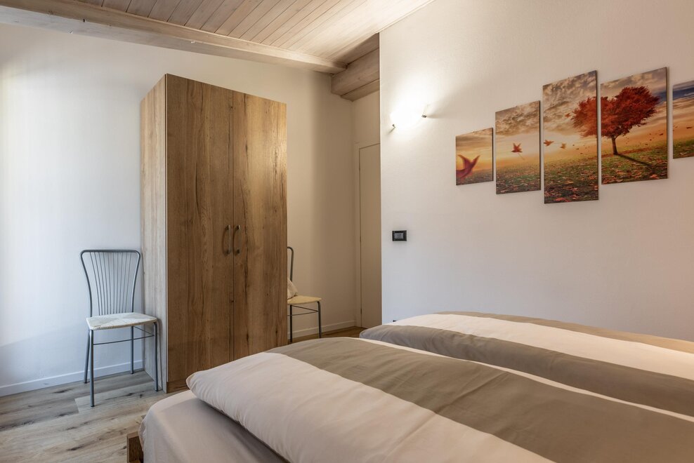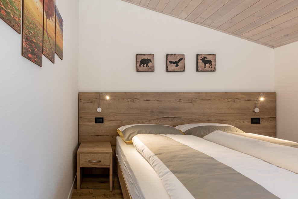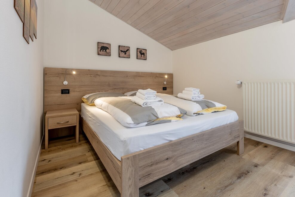 Kuchnia-żyjnia prowadzi na taras z pięknym widokiem na Dolomity di Brenta. Są dwie sypialnie małżeńskie, obie z drzwiami na balkon, które umożliwiają dostęp do drugiego balkonu. Rozkładana sofa podwójna pozwala na zakwaterowanie 6 osób. Przestronna łazienka wyposażona jest w prysznic, bidet, pralkę oraz suszarkę do włosów. Kuchnia jest wyposażona w płytę indukcyjną, lodówkę z zamrażarką, kuchenkę mikrofalową i zmywarkę, telewizor z płaskim ekranem, darmowy Internet-wi-fi. Powierzchnia całkowita 60 m².