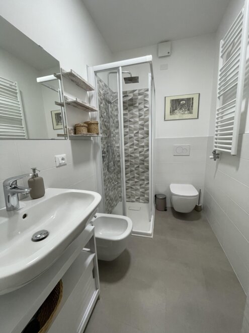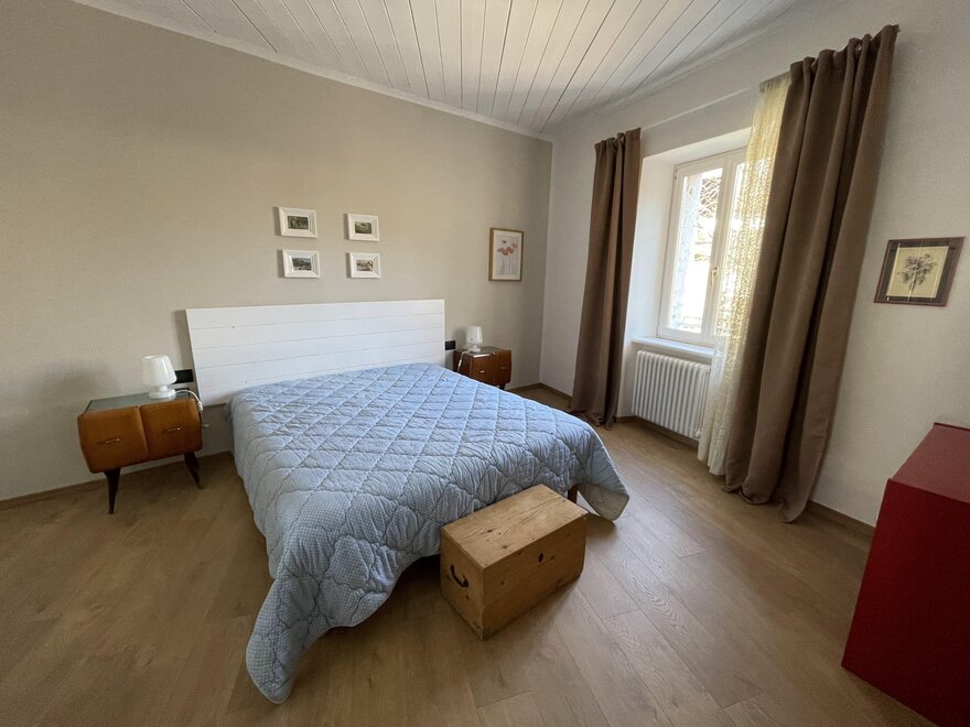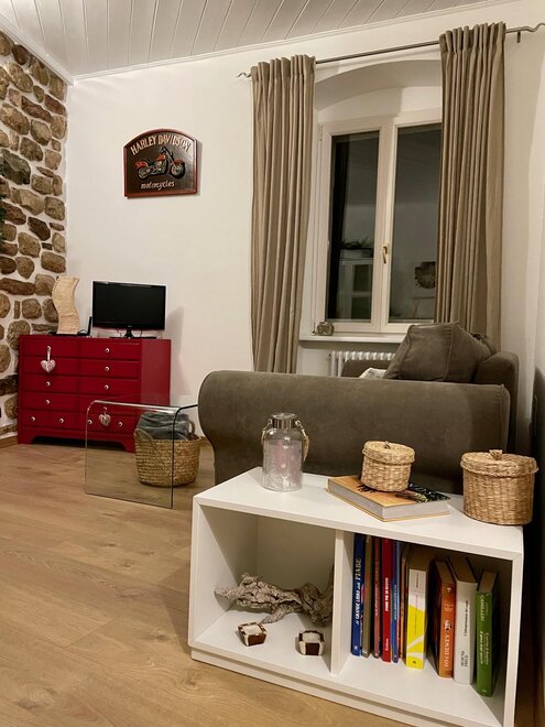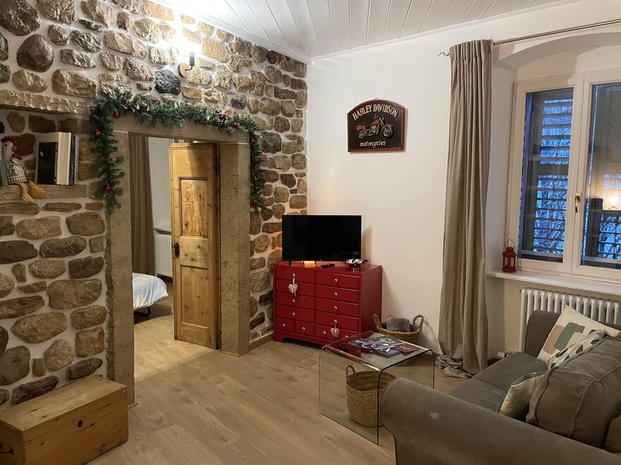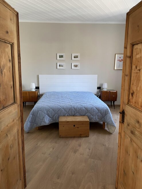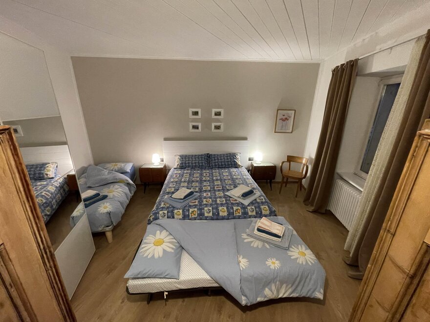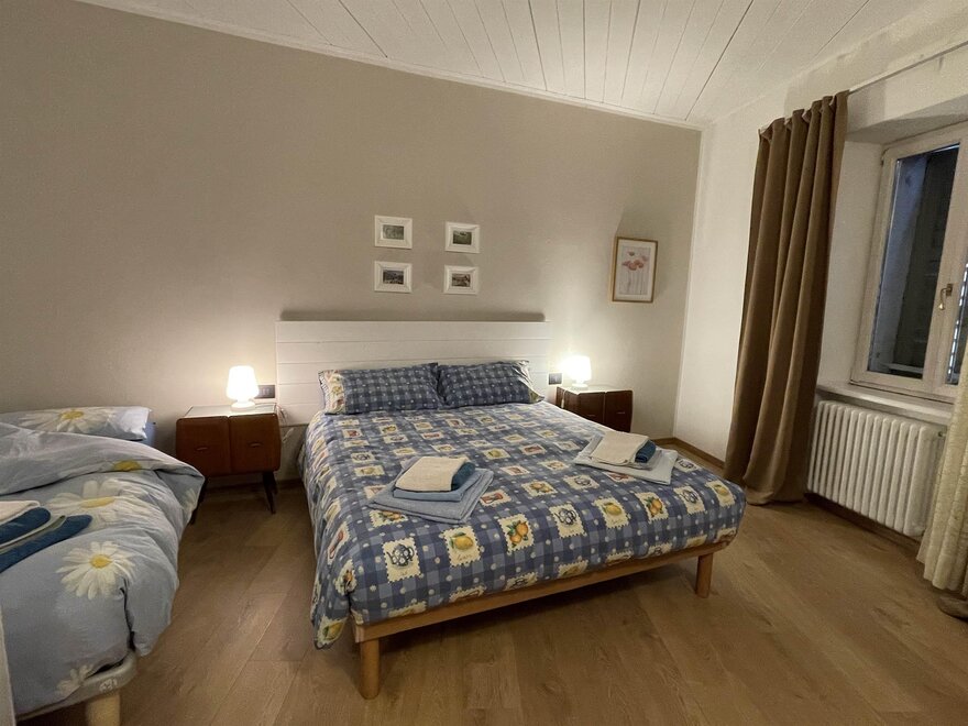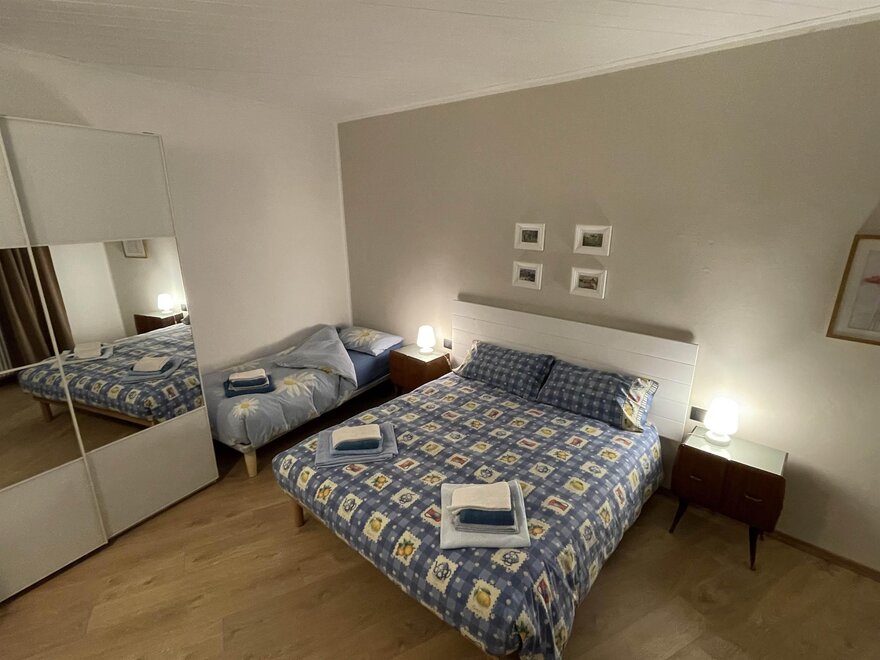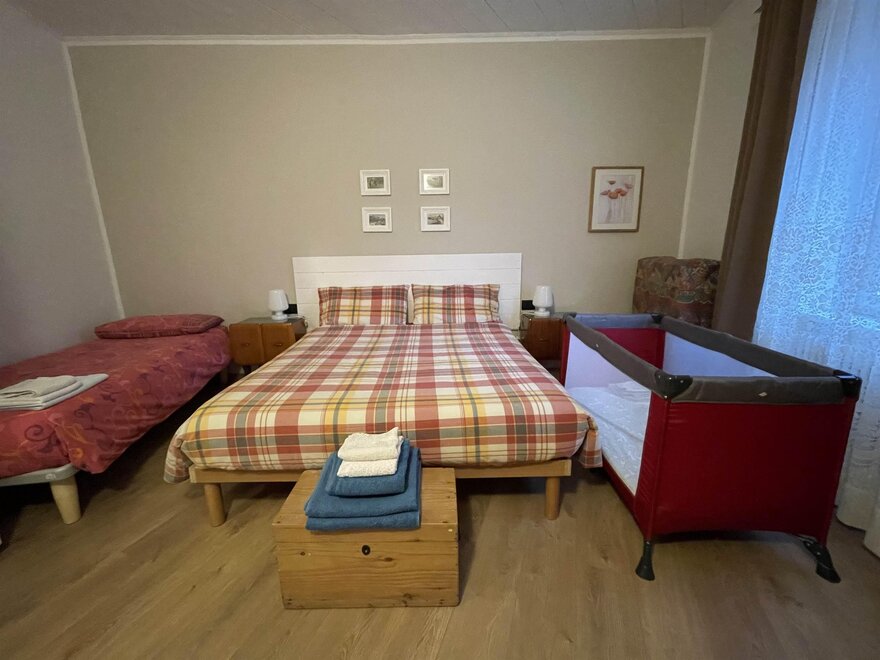 Consisting of a kitchen, living room, bathroom, bedroom with a double bed and a single bed, large covered terrace, secure storage for skis, bicycles, and e-bike charging. An additional bed can be added upon request for an extra charge of 15 euros per night.