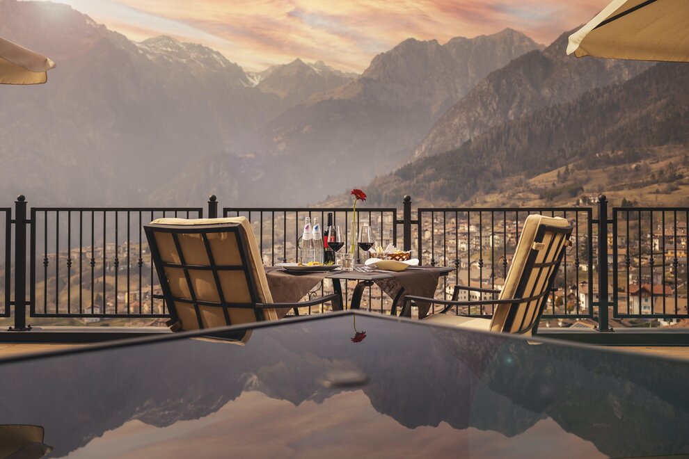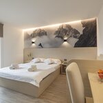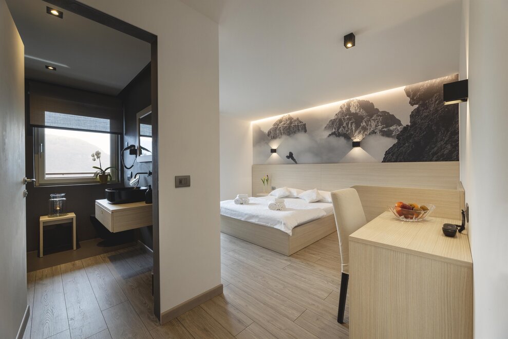 Junior Suite Wellness to nowoczesny pokój o powierzchni 26 m² z widokiem na Dolinę Sarca. Pokój składa się z jednego dużego pomieszczenia, łazienki z prysznicem typu king size z żywicy oraz wanną z hydromasażem dla dwóch osób. Podłoga jest drewniana, a w pokoju znajduje się strefa z herbatą, aby stale umilać pobyt naszym Gościom.