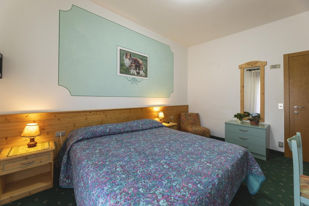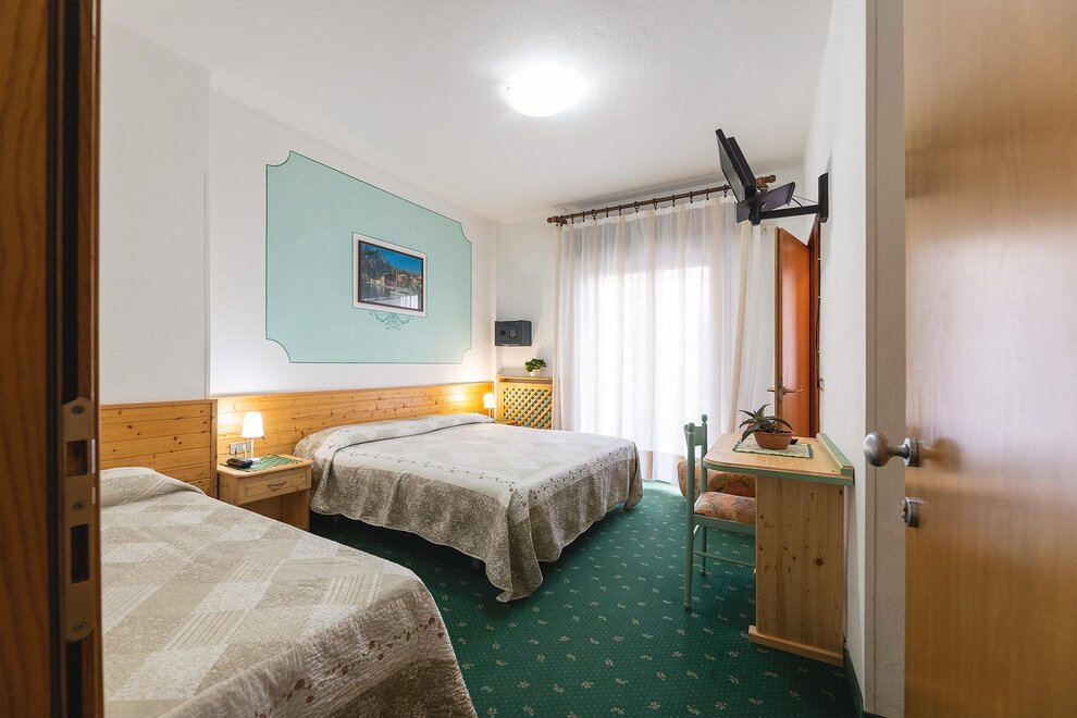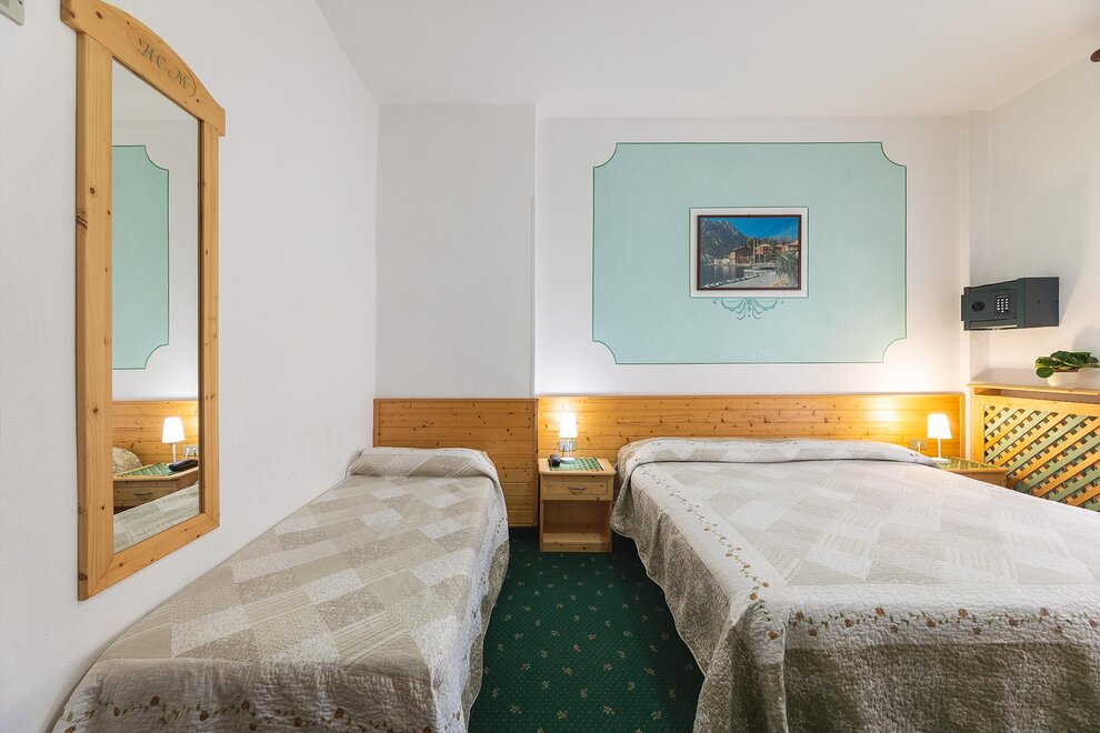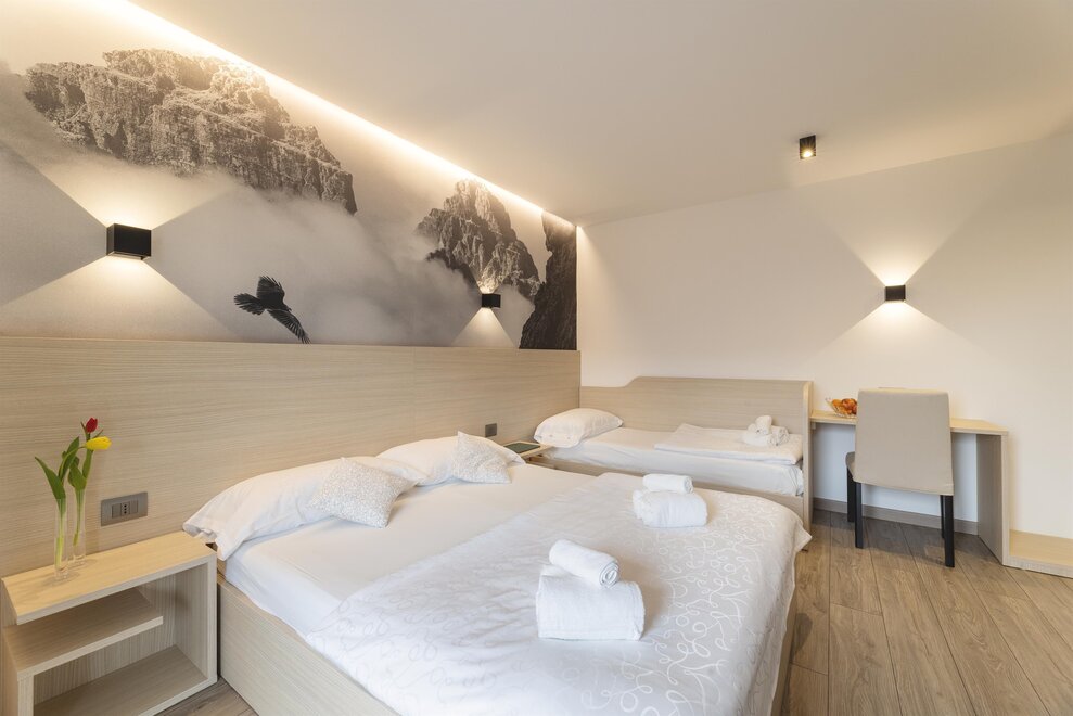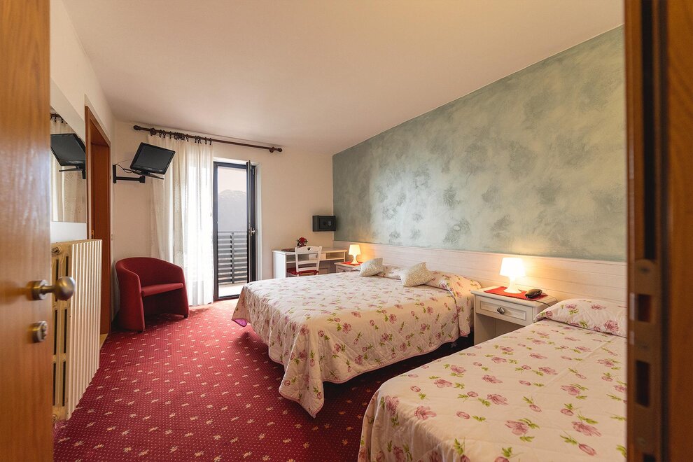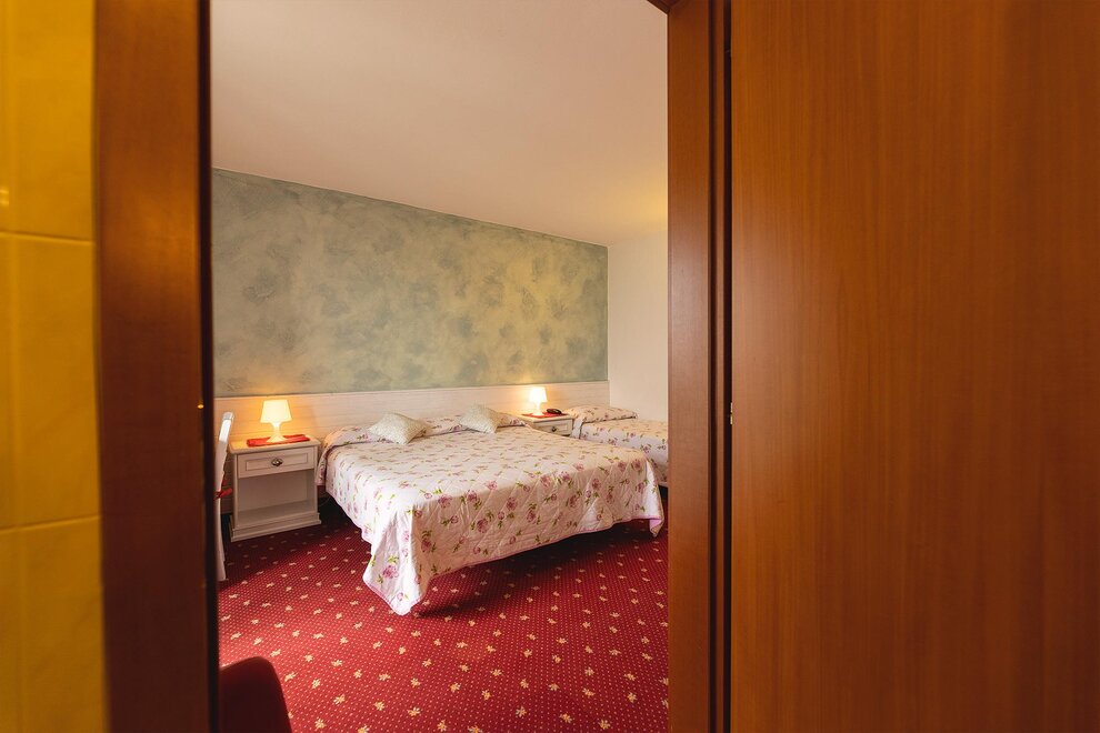 Pokój rodzinny, składający się z 2 oddzielnych pomieszczeń: jednej sypialni małżeńskiej i jednej podwójnej. Łazienka jest wspólna. Doskonały dla rodzin, ponieważ zapewnia prywatność, a jednocześnie wygodę posiadania 2 sąsiadujących pokoi. Przestronny pokój, prosty, ale zadbany, z miękkim dywanem, meblami z naturalnego drewna świerkowego, aby poczuć się absolutnie komfortowo i cieszyć się widokiem na urokliwą miejscowość San Lorenzo u stóp Dolomitów Brenta. Pokoje wyposażone są w sejf, telefon, telewizor LCD, toaletę, łazienkę z prysznicem lub wanną oraz suszarkę do włosów.