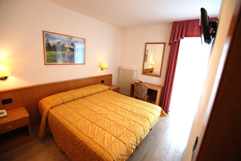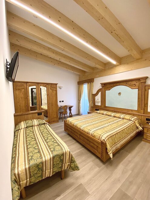 Nowy pokój dla rodzin z łóżkiem podwójnym i piętrowym. Oczywiście nowa jest również łazienka z pięknymi drzwiami szklanymi z wizerunkiem Val di Fassa. Idealny dla rodziny z dwójką dzieci, które chcą być blisko rodziców. Ten pokój ma największy balkon w całym hotelu, prawie małą taras. Pokój, jak wszystkie inne, jest oczywiście wyposażony we wszystkie udogodnienia.
