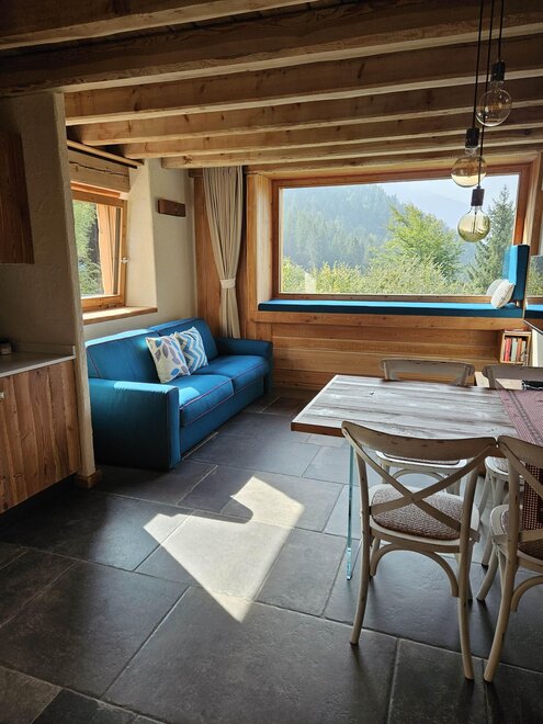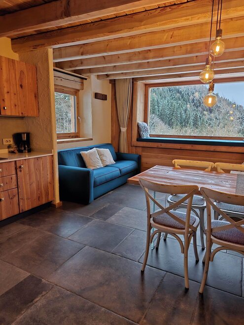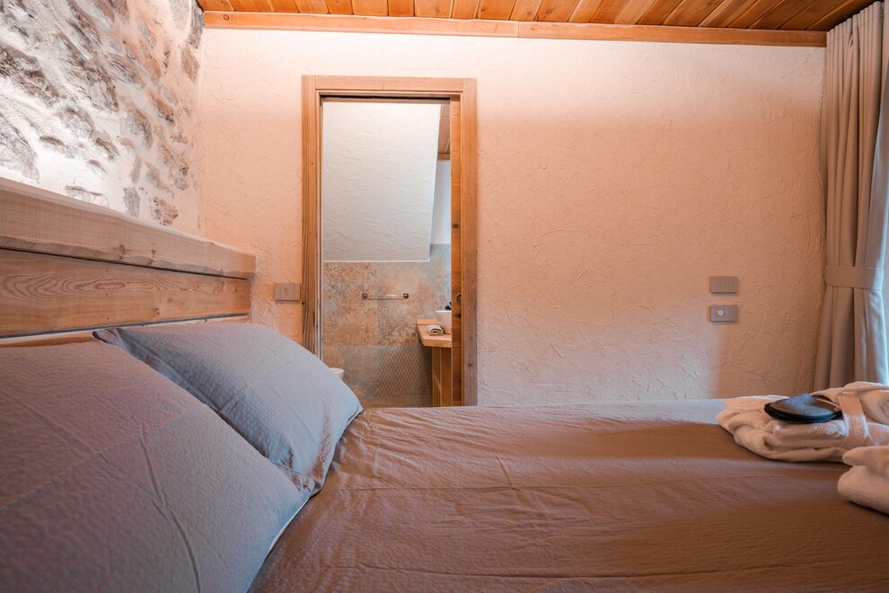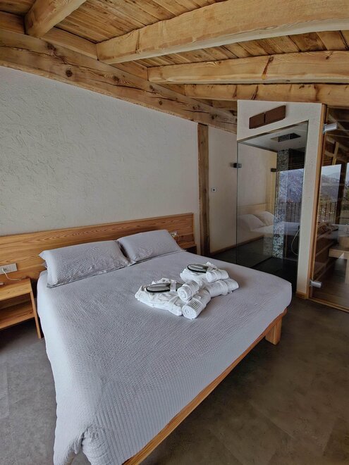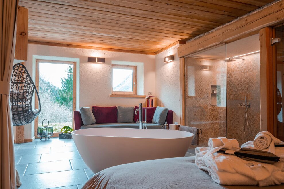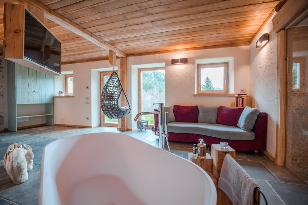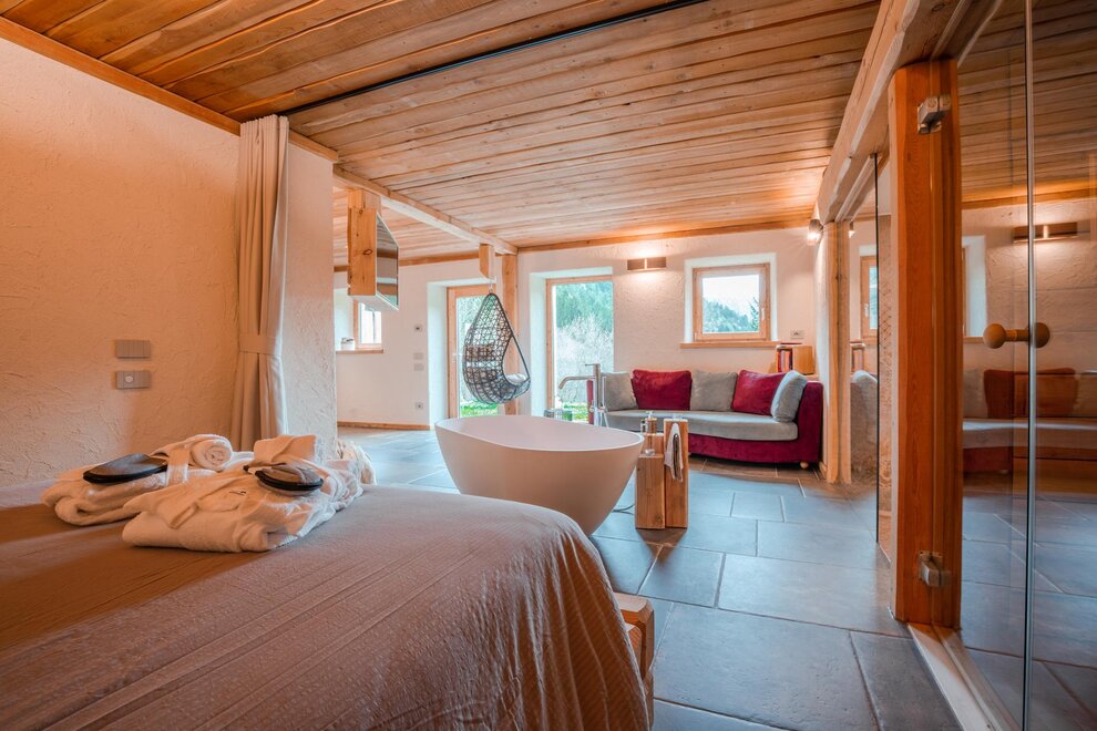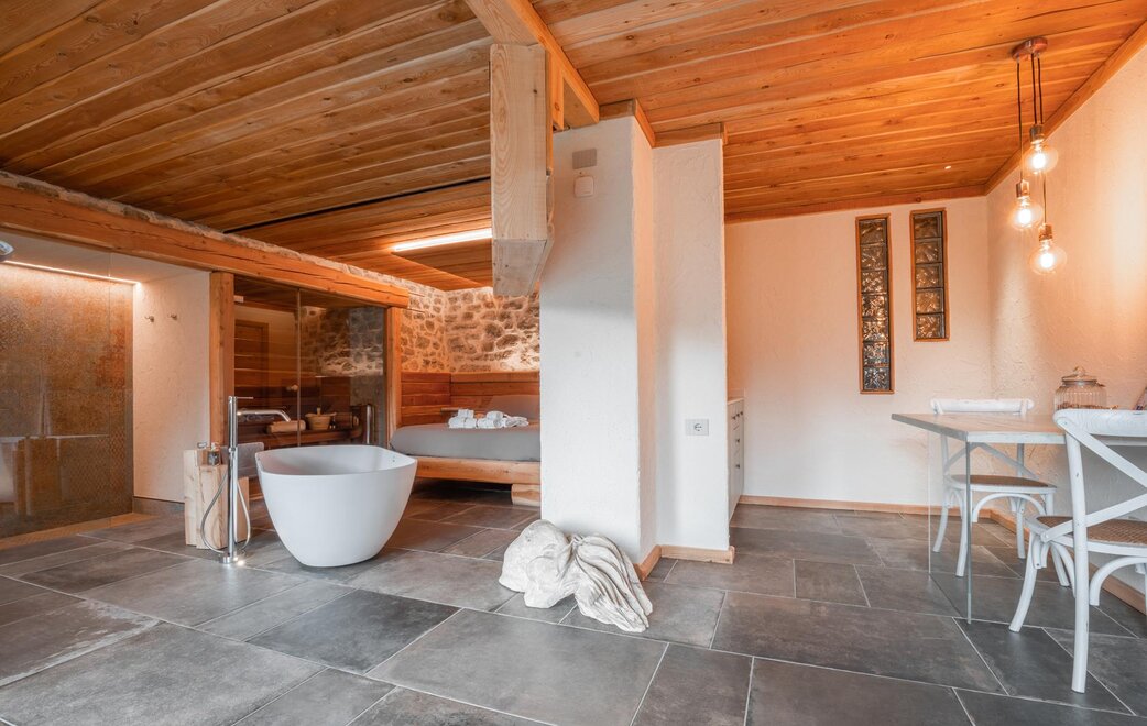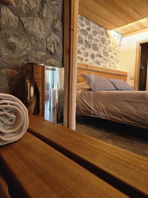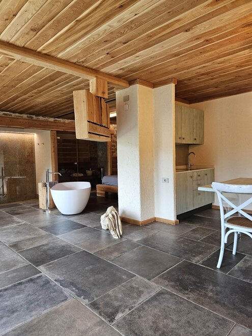 Przestronna kawalerka z wejściem na parterze w eleganckim stylu rustykalnym z kamieniem i odsłoniętymi belkami. Mała oddzielna kuchnia w salonie z rozkładaną sofą. W sypialni prywatna sauna, wanna i prysznic na widoku. Pełna łazienka. Piękny prywatny ogród z krzesłami i stolikiem.
