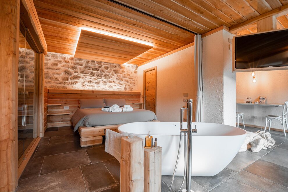 Przestronna suite z wejściem na parterze, małą kuchnią w salonie z kanapą rozkładaną i prywatnym ogrodem. Na piętrze znajduje się sypialnia z prywatną sauną, prysznicem widokowym, łazienką i tarasem.