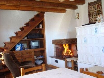 - Parter: kuchnia (kuchenka gazowa, lodówka/zamrażarka) oraz jadalnia z stołem i kominkiem.