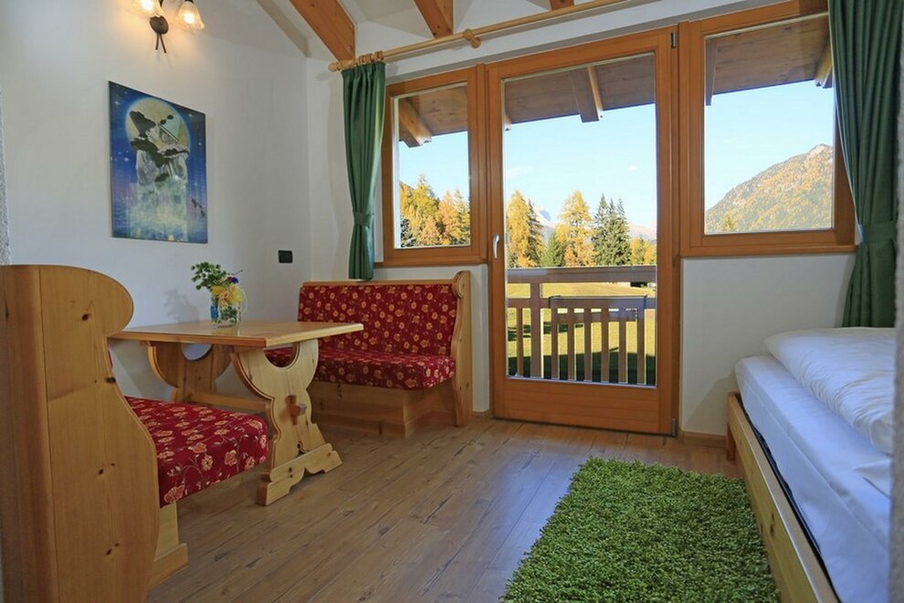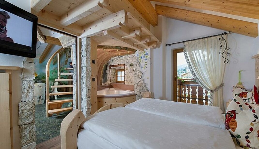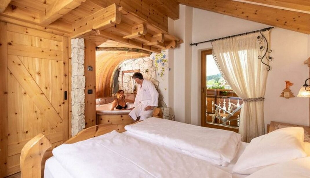 Suite Sowa: Bajka w Zaczarowanym Lesie Sowy, w przeciwieństwie do powszechnych przekonań, to zwierzęta przynoszące wyjątkowe szczęście, symbol wiedzy i mądrości. I oto pomyśleliśmy o suite poświęconej tym mądrym strażnikom lasu, gdzie można wspólnie się bawić, jednocześnie szanując przestrzeń wszystkich. Tylko w twoim pokoju możesz spacerować po trawie pokrytej igłami sosnowymi i wspinać się z dziećmi na drewnianą chatkę: mały zaczarowany las, gdzie nadal można marzyć nawet na jawie! Twoje dzieci będą mogły spróbować wyjątkowego doświadczenia spania w domku na drzewie, w całkowitym bezpieczeństwie. Ty i twój partner będziecie mogli cieszyć się przyjemnością pobytu w górskim domku wyposażonym w każdy komfort, jak okna z widokiem na Dolomity oraz jacuzzi.