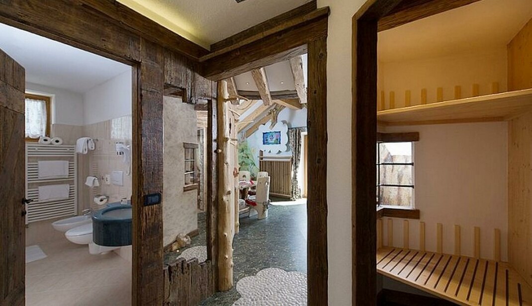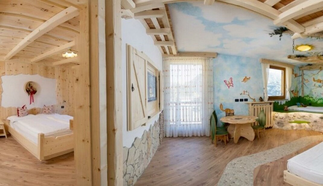 W Suite Malga poczuje się jak w prawdziwej szczęśliwej farmie. Mnóstwo niespodzianek w pokoju dziecięcym: zjeżdżalnia (tak, zjeżdżalnia w dziecięcym pokoju), mostek do przekraczania nowych rzek wyobraźni i wielu małych przyjaciół do zabawy. Na ścianach, malowidła Dolomitów i błękitne niebo tworzą wrażenie zabawy na świeżym powietrzu! Intymność i ciepło w sypialni mamy i taty: wanna z hydromasażem, zapach drewna i wiele pieszczot przy przyciemnionym świetle.