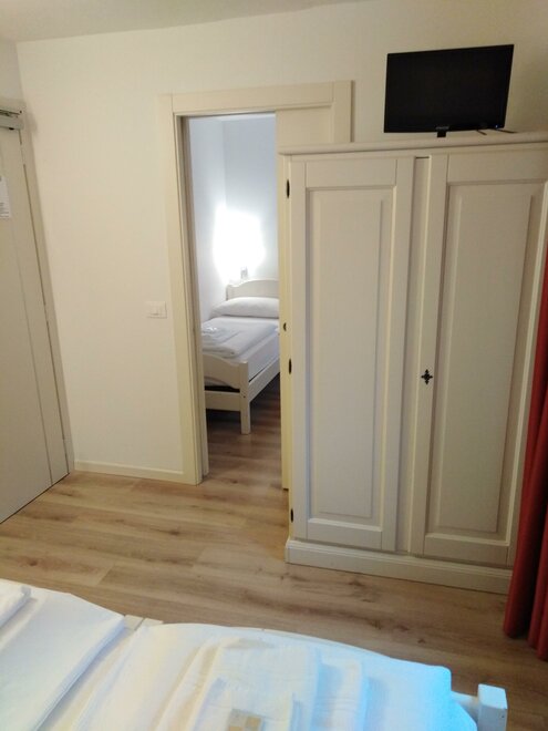 Pokój z łóżkiem małżeńskim i łóżkiem pojedynczym, umeblowany w podstawowe meble z białego drewna z szczególną dbałością o czystość. Wygodny i przytulny, dzięki podłodze drewnianej, stanowi idealne rozwiązanie dla rodzin poszukujących relaksujących wakacji w sercu lasów Alpe Cimbra, zaledwie kilka kroków od tras narciarskich. Wyposażony w drzwi z wyjściem na tył, gdzie można podziwiać pierwsze promienie słońca rano. W pokoju znajduje się łazienka prywatna z prysznicem i suszarką do włosów.