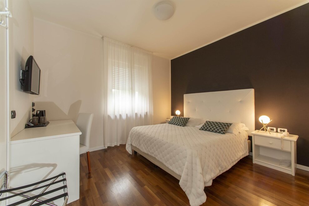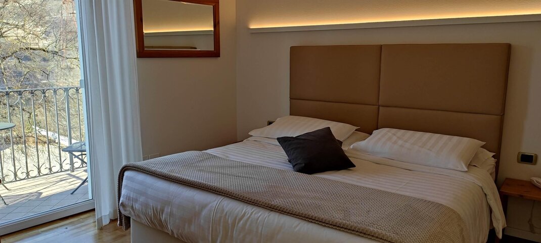 Jasność zapewniają duże okna, a także drzwi balkonowe wychodzące na balkony, z których wiele ma widok na jezioro: naturalne światło łączy się z ciepłymi odcieniami akcesoriów i dodatków, odzwierciedlając atmosferę całego domu. (Hotel Lillà)Wyposażenie pokoju