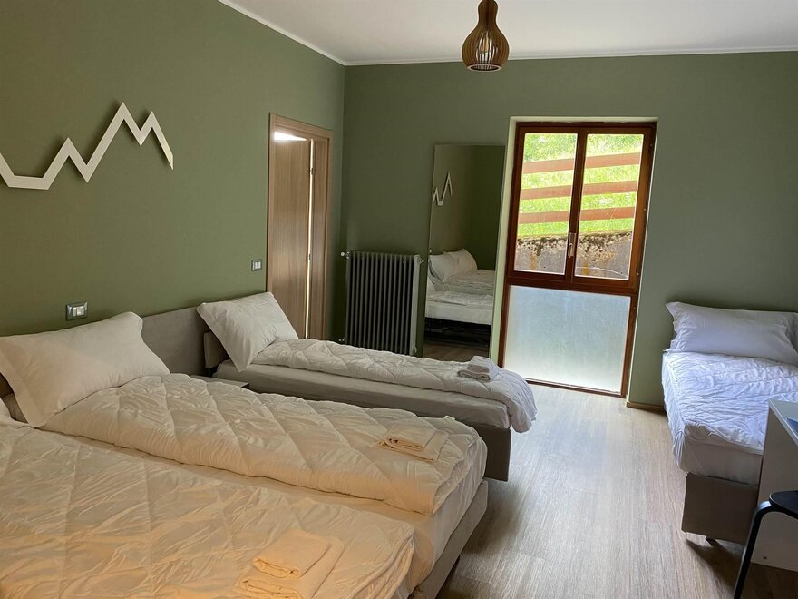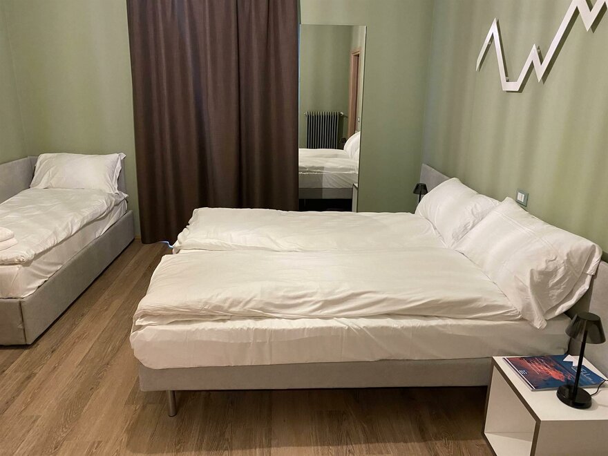 Trzyosobowy pokój, składający się z łóżka małżeńskiego i łóżka pojedynczego lub trzech łóżek pojedynczych, wyposażony w prywatną łazienkę z prysznicem, sejf, minibar oraz telewizor smart 32'' z płaskim ekranem