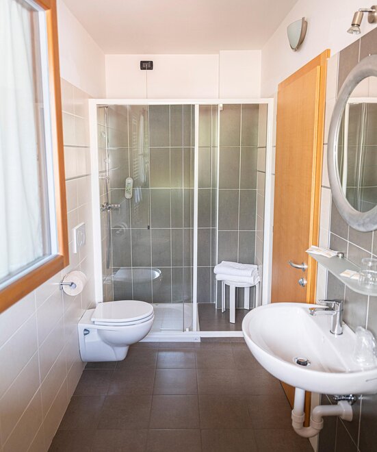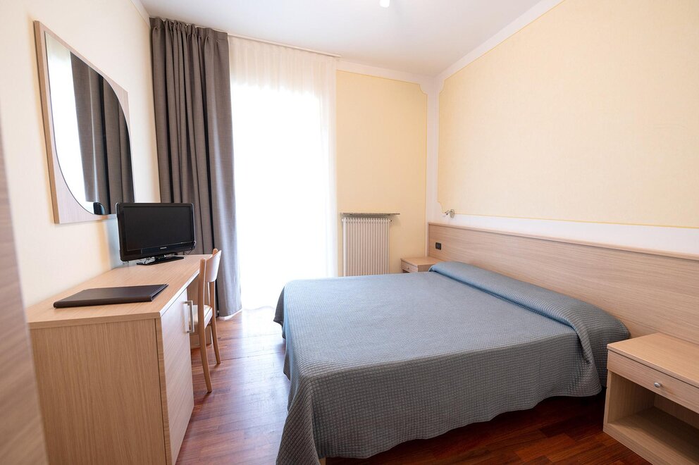 Przestronny pokój, całkowicie wyremontowany, nowoczesny, materac nowy h 22cm, okna dźwiękoszczelne, wszystkie z balkonem od strony alei lub ogrodu, podłoga laminowana, sejf, telefon, telewizor LCD, łazienki z eleganckimi wykończeniami, niektóre z prysznicem king size i słuchawką prysznicową, przybory toaletowe i suszarka do włosów. Mogą pomieścić do 3 dorosłych i być rezerwowane z łóżkiem małżeńskim, lub także trzy pojedyncze