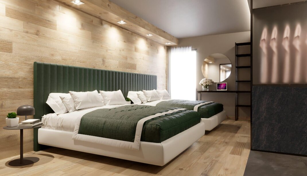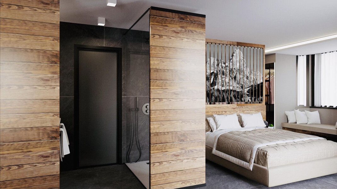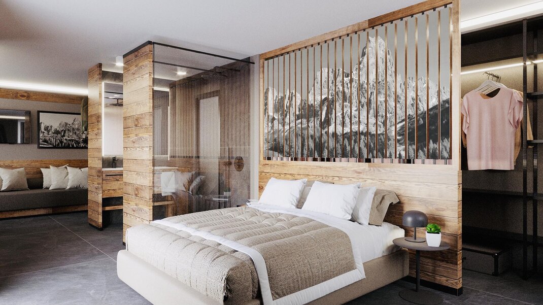 SUITE O POWIERZCHNI 40 M2, 2 POKOJE, BALKON Z WIDOKIEM NA DOLOMITY ORAZ EMOCJONALNY PRYSZNIC.