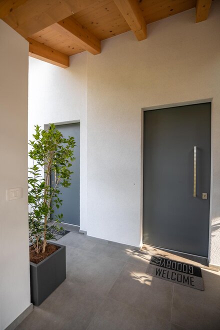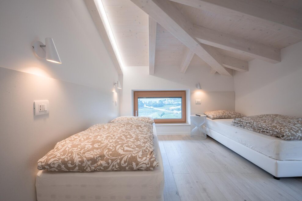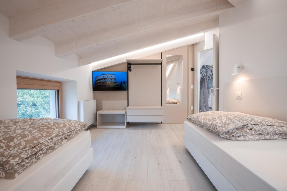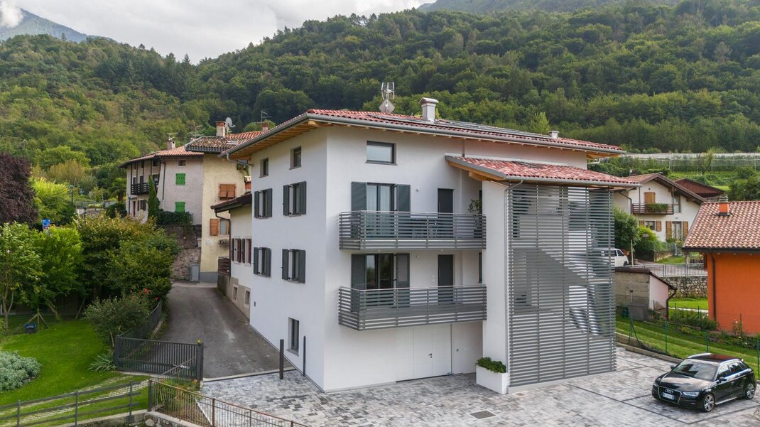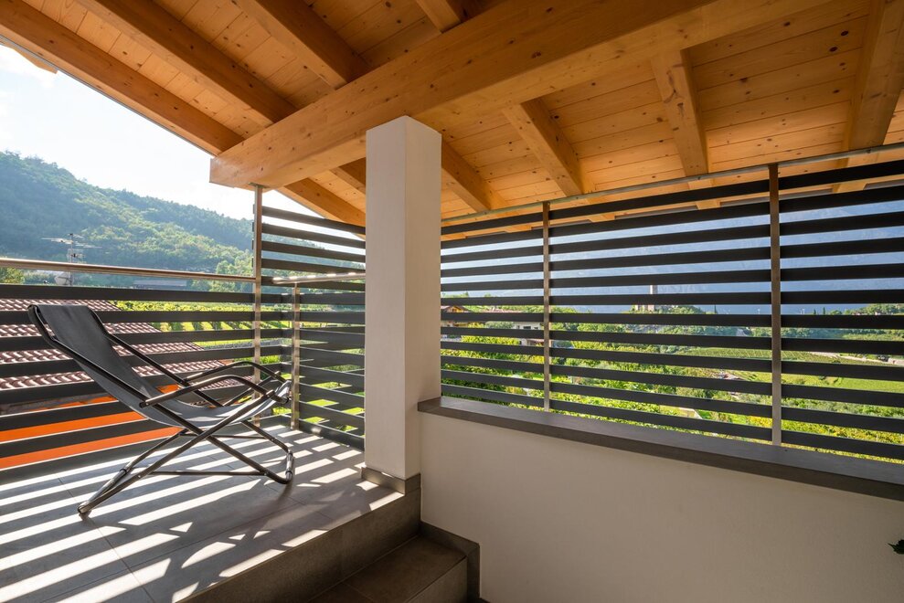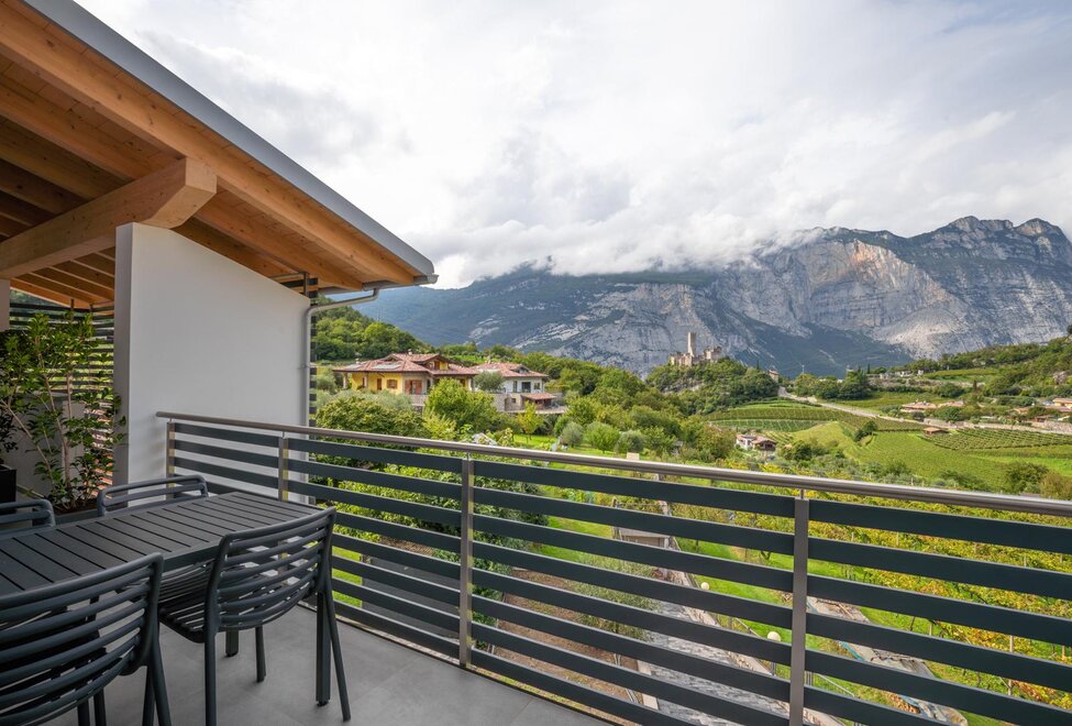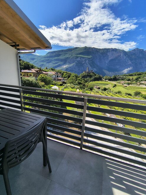 Na górze znajduje się panoramiczny balkon z pięknym widokiem na zabytkowy zamek Drena, wyposażony w stół i suszarkę do bielizny.