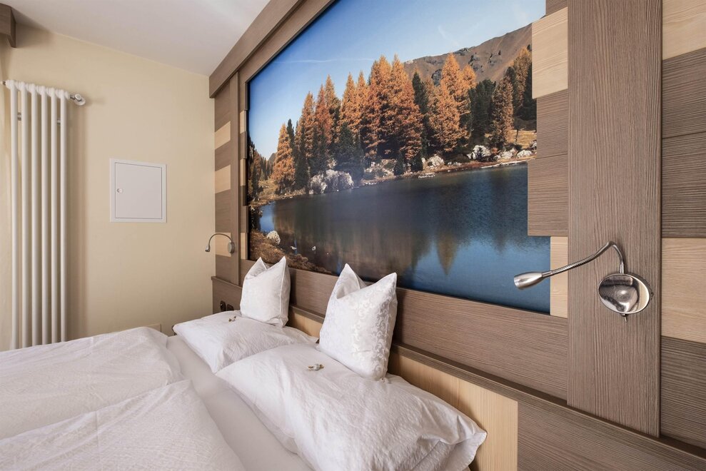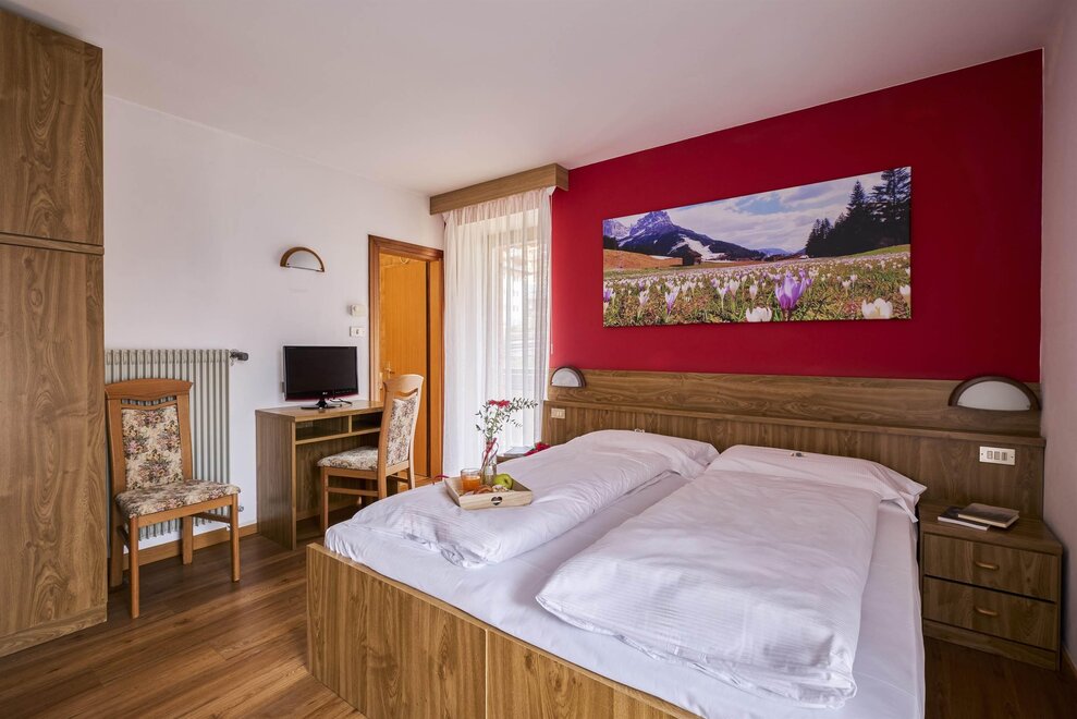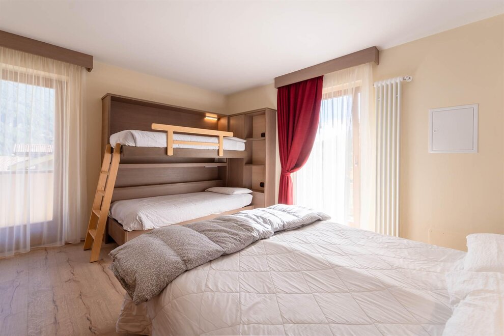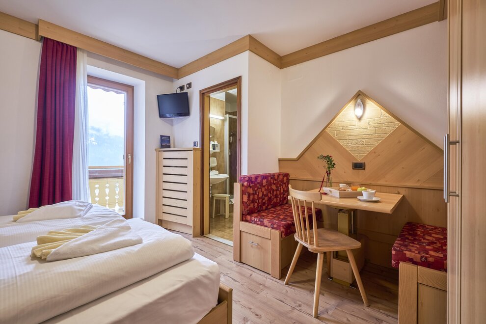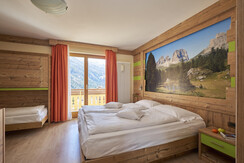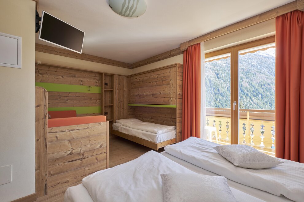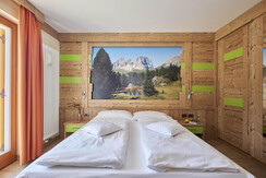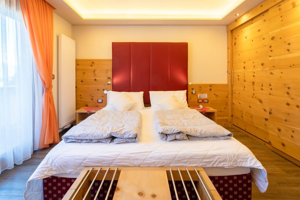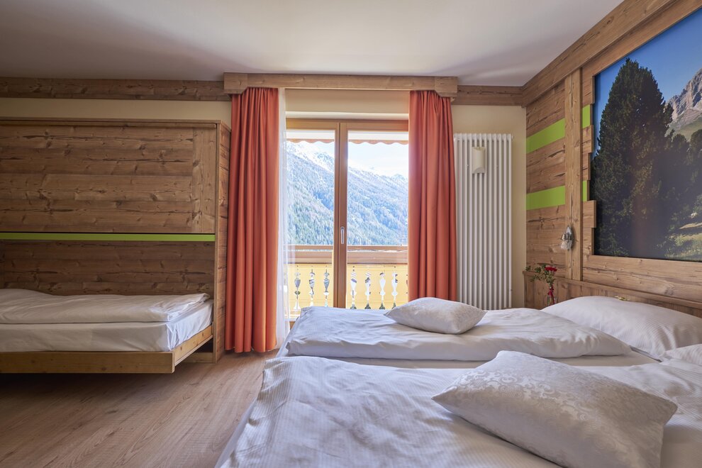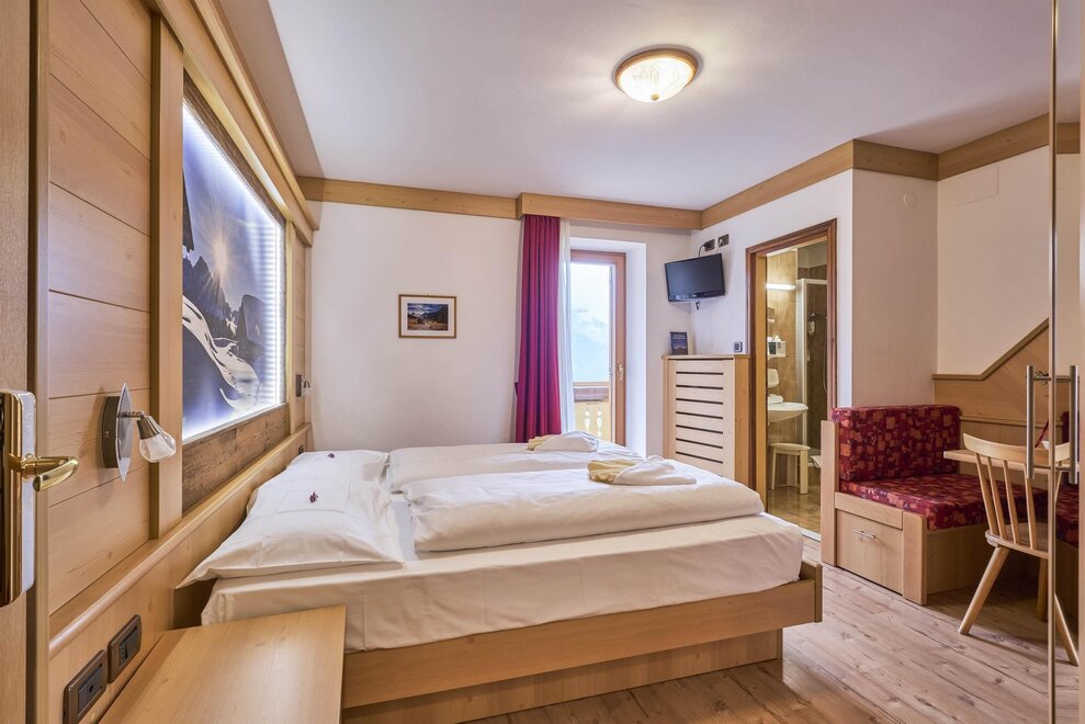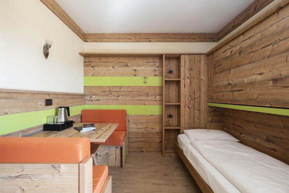 Przytulna i autentyczna atmosfera, stworzona przez naturalne drewno i kolory inspirowane alpejską naturą, natychmiast zaprasza do relaksu. Pokój dysponuje wygodnym łóżkiem małżeńskim oraz piętrowym łóżkiem, które można również wykorzystać jako sofę. Z okien rozpościera się widok na zapierające dech w piersiach krajobrazy: na północy Roda di Vael, na południu Cima Dodici. Oaza spokoju, w której każdy poranek towarzyszy widokom Dolomitów.