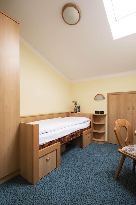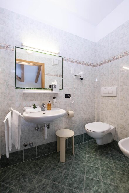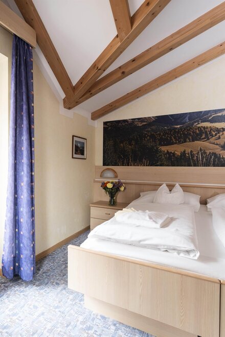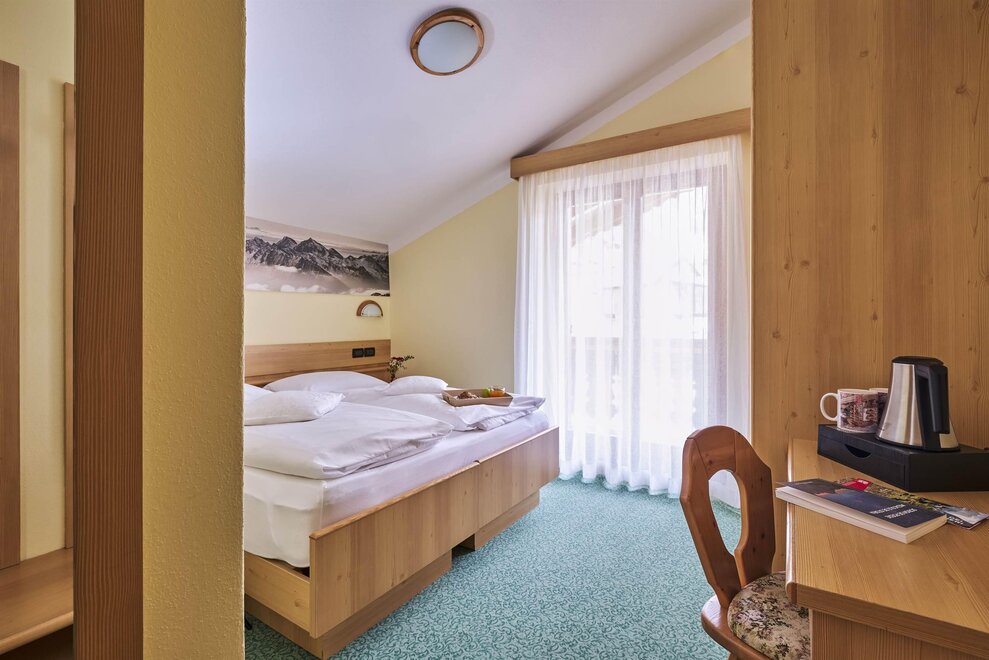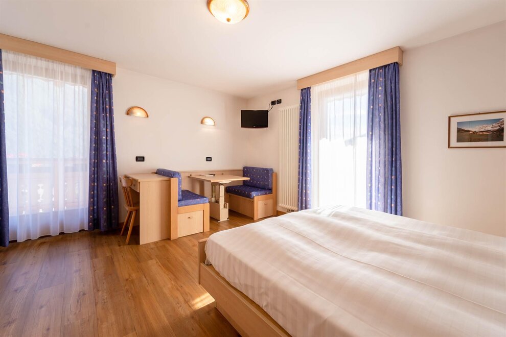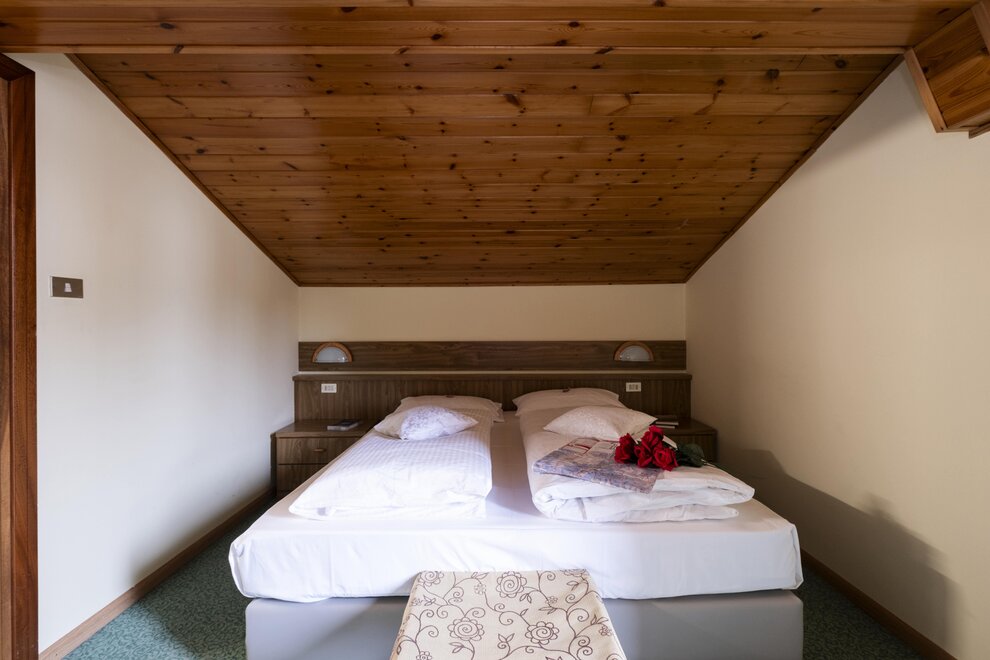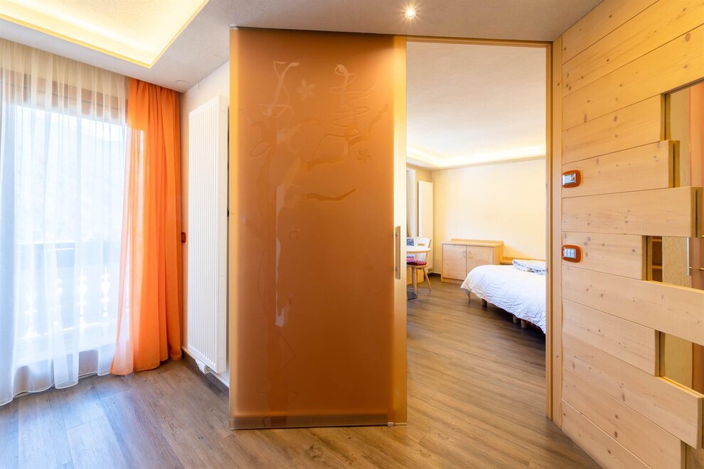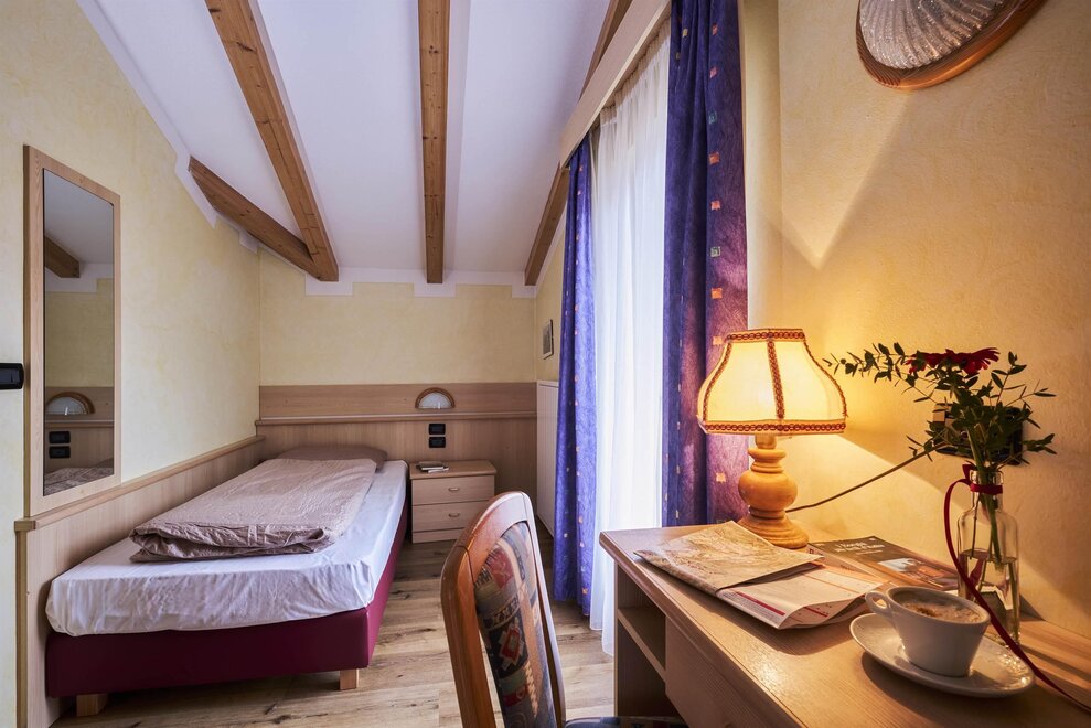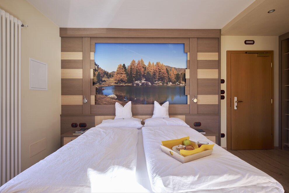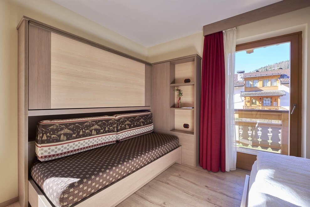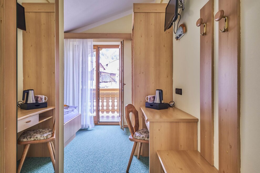 Przytulna i autentyczna atmosfera, stworzona przez naturalne drewno i kolory inspirowane alpejską naturą, natychmiast zaprasza do relaksu. Pokój dysponuje wygodnym łóżkiem małżeńskim oraz piętrowym łóżkiem, które można również wykorzystać jako sofę. Z okien rozpościera się widok na zapierające dech w piersiach krajobrazy: na północy Roda di Vael, na południu Cima Dodici. Oaza spokoju, w której każdy poranek towarzyszy widokom Dolomitów.