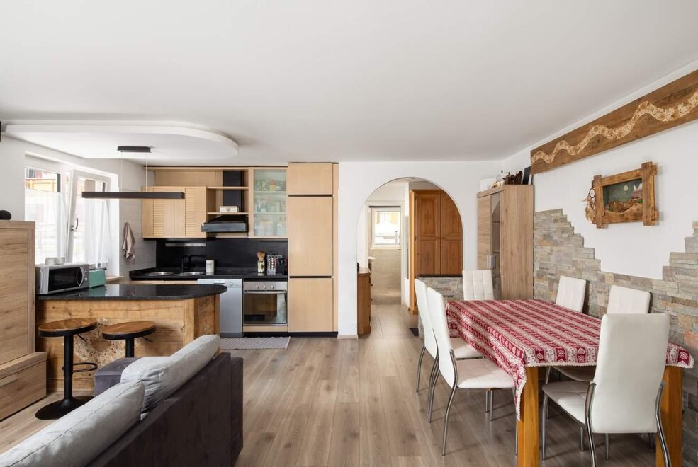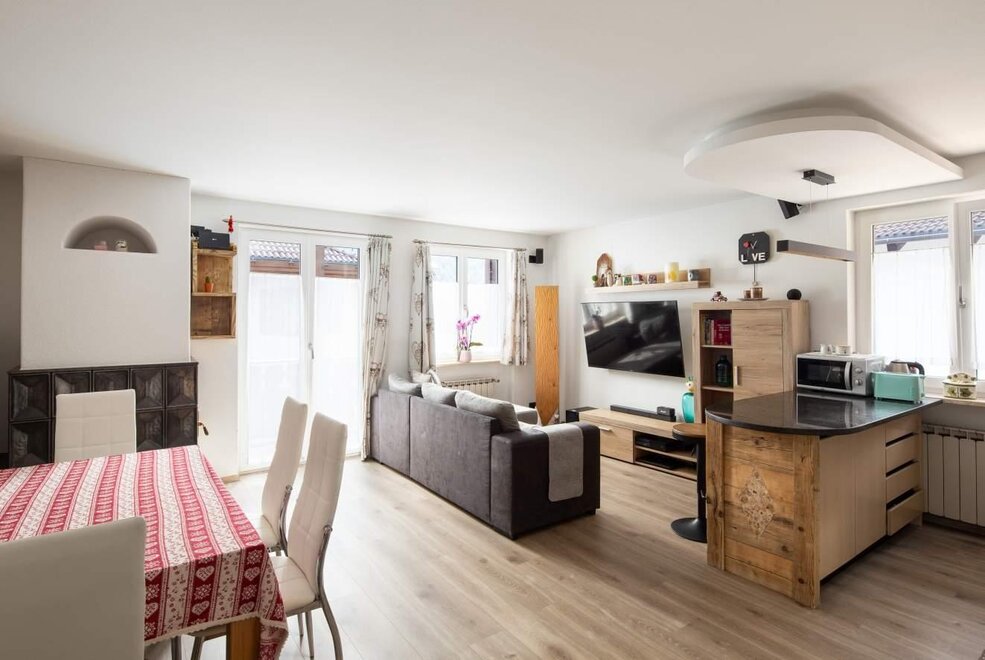 Przestronny apartament 2+2 (sypialnia z podwójnym łóżkiem + sofa rozkładana lub możliwe dodatkowe łóżko dla dziecka), składający się z dużego salonu z aneksem kuchennym i piecem na olej, łazienki z oknem i prysznicem, jasnej sypialni oraz 2 balkonów. Wyposażony w płytę indukcyjną, zmywarkę, lodówkę z zamrażarką, suszarkę do włosów oraz wszystkie niezbędne akcesoria kuchenne. W piwnicy dostępny garaż na przechowanie samochodu, nart, butów narciarskich, rowerów i ładowanie e-bike'ów; na zewnątrz miejsca parkingowe dla mieszkańców. Dostępna pościel, ręczniki oraz akcesoria kuchenne, podatek turystyczny nie jest wliczony.