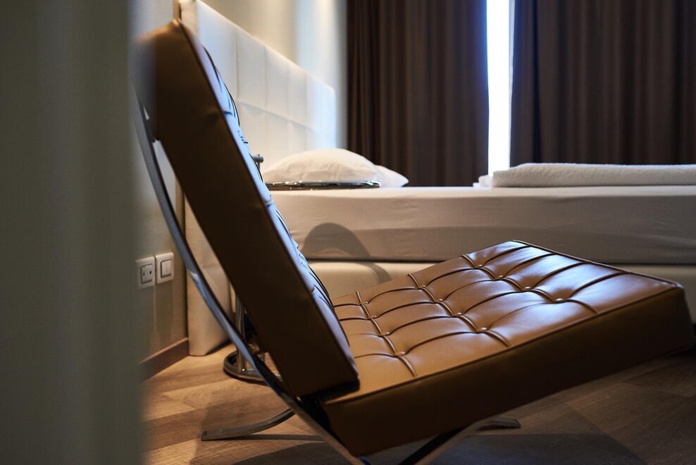 The room includes the Barcelona chair by Ludwig Mies van der Rohe, a double bed and one extra open-top single bed, individually regulated air-conditioning, 40” digital TV, free wifi connection, minibar, fresh fruit. The bathroom in withe corian is equipped with King size shower, hairdryer and courtesy set.
