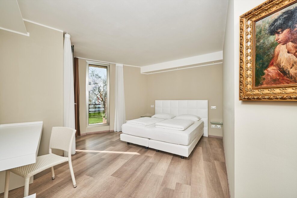 Junior Suite z dużym ogrodem z widokiem na Jezioro Garda to zakątek spokoju, w którym można na nowo odkryć zmysły w cieniu kwiatów "Bouganville" na leżakach z ręcznikami. Junior Suite o nowoczesnym designie ma przestronną szafę z sejfem na laptopa, podwójne łóżko + 1 łóżko jednoosobowe Open Top, klimatyzowane pomieszczenia, telewizor/satelitarną TV 40", bezpłatny Internet WI-FI, minibar i świeże owoce. Łazienka w Corianie z prysznicem wyposażona jest w suszarkę do włosów i zestaw kosmetyków.