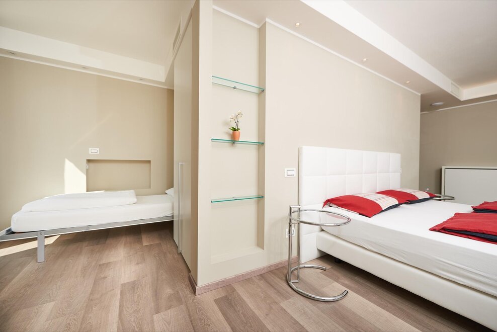 Warmed by the first rays of sun that light up the atmosphere from the early morning, this light and airy room provides you with great facilities. It has a roundish and harmonious architecture and has a spacious walk-in wardrobe with safe box, double bed and one extra open-top single bed, individually regulated air-conditioning, 40” digital TV, free wifi connection, minibar. The contemporary bathroom in withe corian is equipped with a king size shower, hairdryer and courtesy set.
