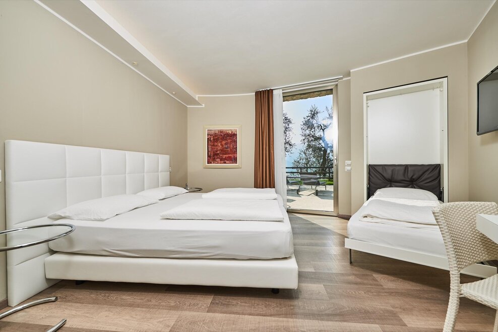 Pokój tradycji, z antycznym kamiennym zbiornikiem, który ogrzewa atmosferę ogrodu z widokiem na Jezioro Garda, wita was leżakami do opalania i ręcznikiem do kąpieli dla waszego relaksu. Pokój o prostych liniach ma podwójne łóżko + 1 łóżko jednoosobowe Open Top oraz autonomiczne klimatyzowane pomieszczenia, telewizor/SAT cyfrowy 40”, sejf na laptopa, bezpłatny Internet WI FI i minibar. Łazienka w Corianie z prysznicem King size wyposażona jest w suszarkę do włosów i zestaw kosmetyków.