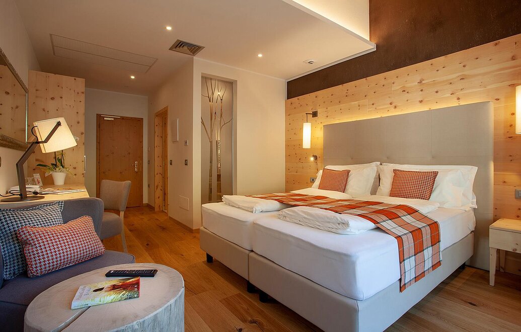 Komfortowy pokój o powierzchni 25 m² z umeblowaniem z sosny larice lub cirmolo oraz drewnianą podłogą. Pokój Elite jest przytulny i wyposażony w balkon, sofa rozkładowa, telefon, telewizor, sejf, minibar, klimatyzację, bezpłatne wi-fi oraz łazienkę z prysznicem i suszarką do włosów.