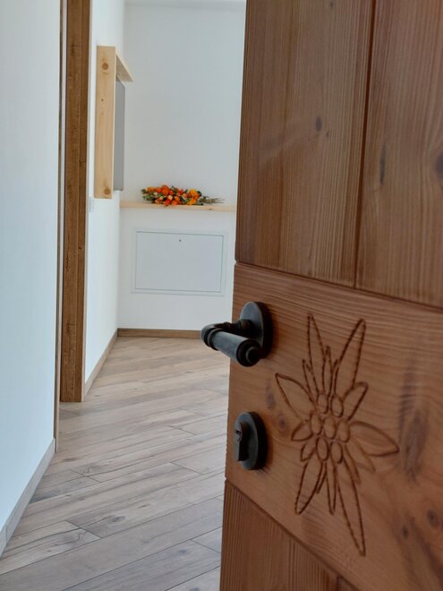 Urocze trzypokojowe mieszkanie w stylu górskim położone w Miola-Fovi, dzielnicy Baselga di Piné, na parterze domu jednorodzinnego, wolne z 3 stron (jedynymi mieszkańcami są właściciele na piętrze).