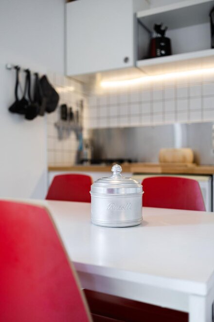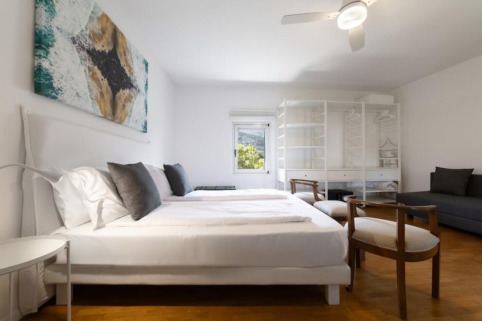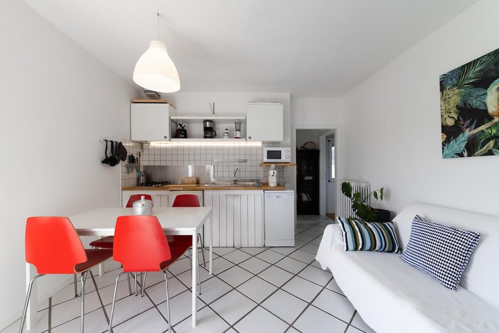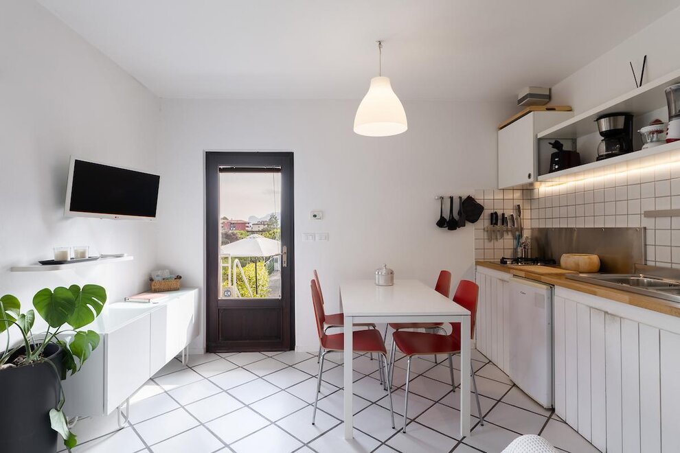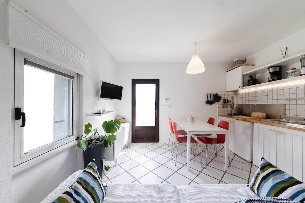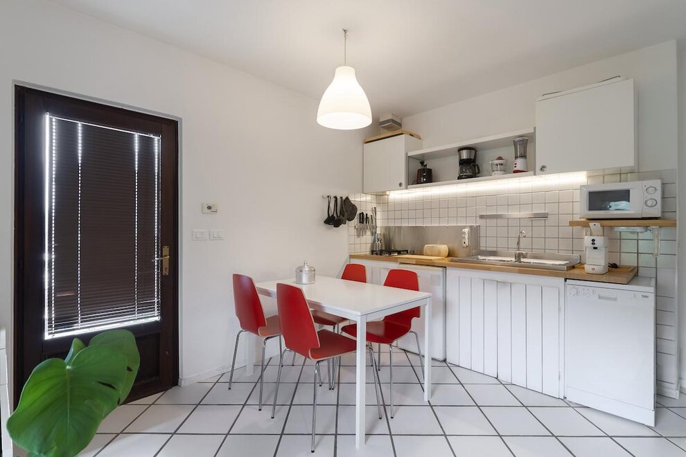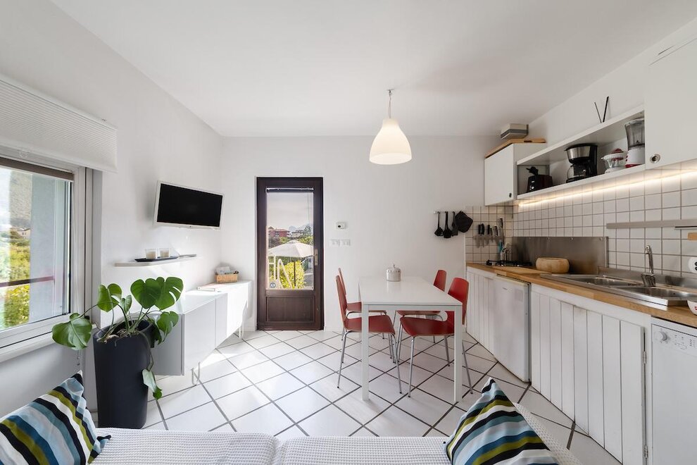 IT "mieszkanie urządzone ze smakiem, składający się z dużej sypialni wielkości, pokój dzienny z aneksem kuchennym ze zmywarką, łazienka z prysznicem i oknem. Do dyspozycji gości jest mały taras przy wejściu, ogród z leżakami i miejsce do grillowania wraz z stół i krzesła na świeżym powietrzu. Prywatny parking i darmowy internet wi-fi. Idealny dla małych rodzin, par sportowych i święta z psem.